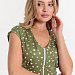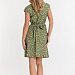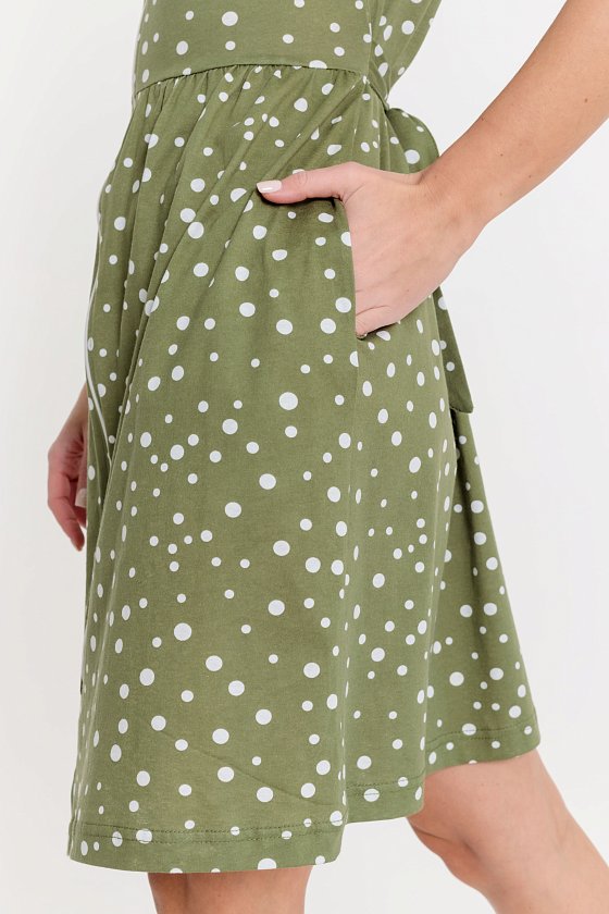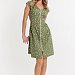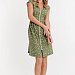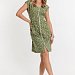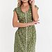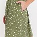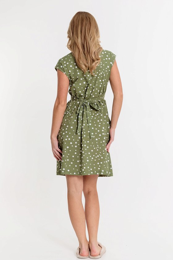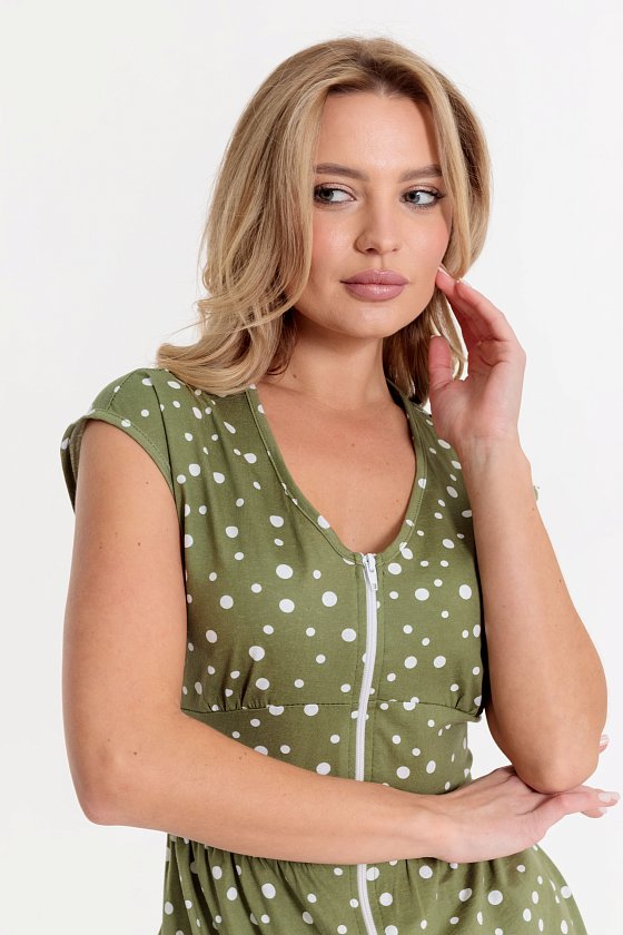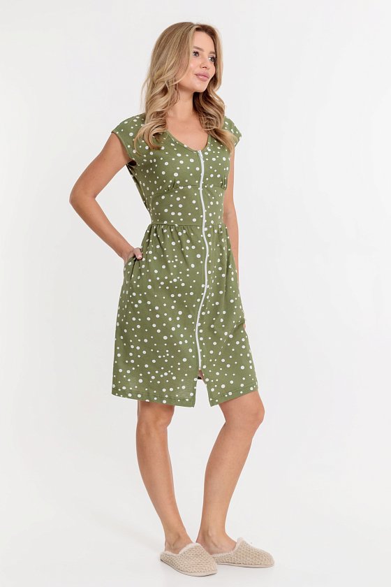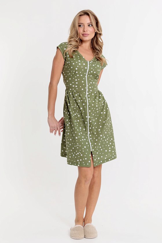 Халат выполнен из х/б полотна с набивным рисунком. Халат застёгивается на молнию, в боковых швах расположены карманы. Горловина и проймы обработаны бейкой. Сзади расположен фиксирующий по талии пояс.