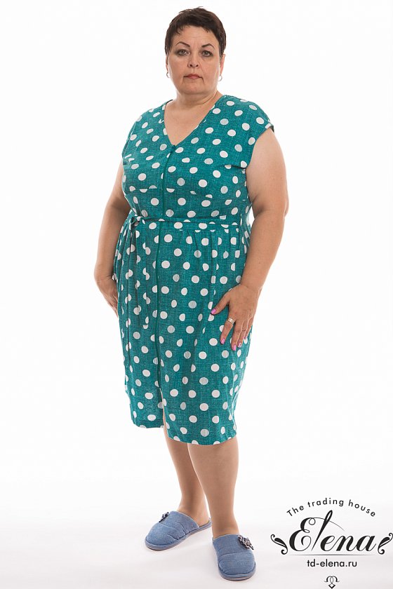 Халат выполнен из х/б полотна с набивным рисунком. Халат застёгивается на молнию, в боковых швах расположены карманы. Горловина и проймы обработаны бейкой. Сзади расположен фиксирующий по талии пояс.