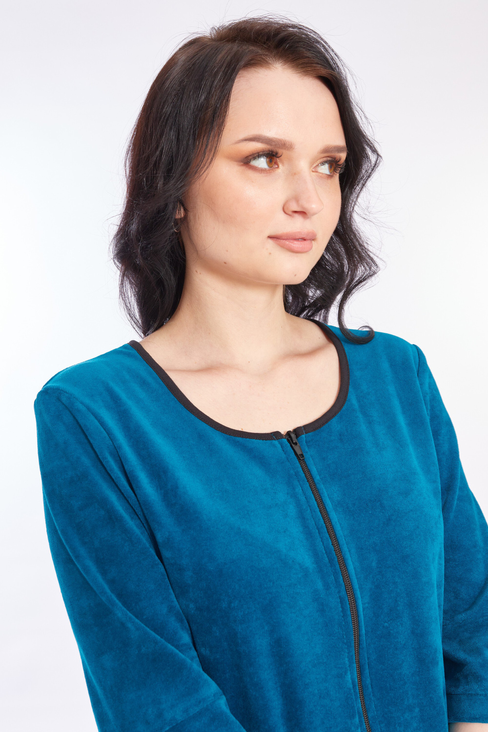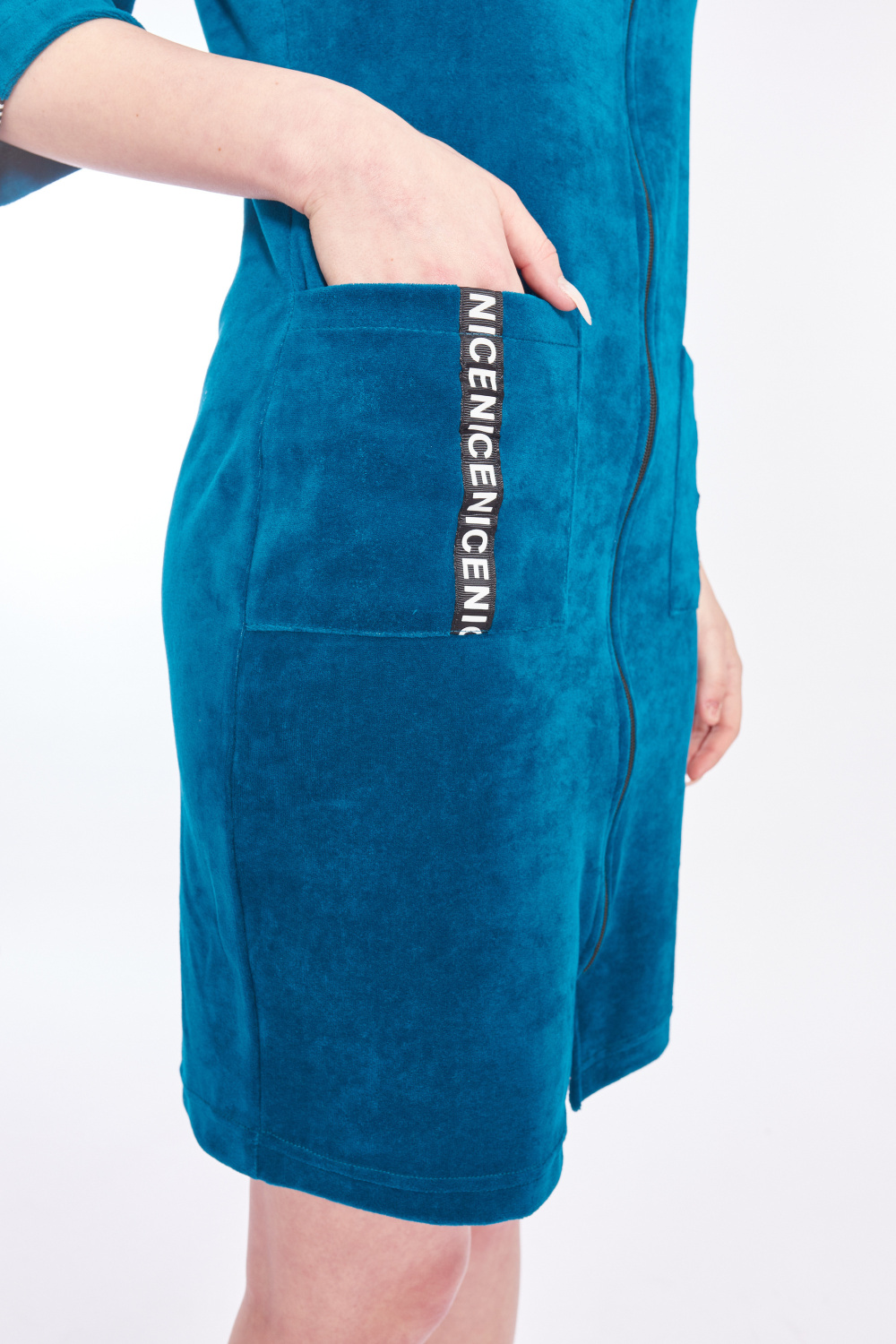 Халат выполнен из велюра. Центральная застёжка на молнию, рукава длиной 3/4. Спереди расположены два накладных кармана. На рукавах и карманах в качестве отделки настрочена репсовая лента.