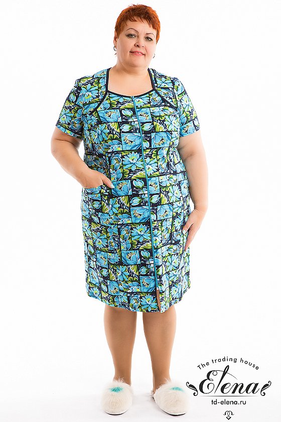 Халат выполнен из х/б полотна с набивкой. Застёжка на молнию, по бокам расположены карманы. Горловина обработана контрастной по цвету бейкой.