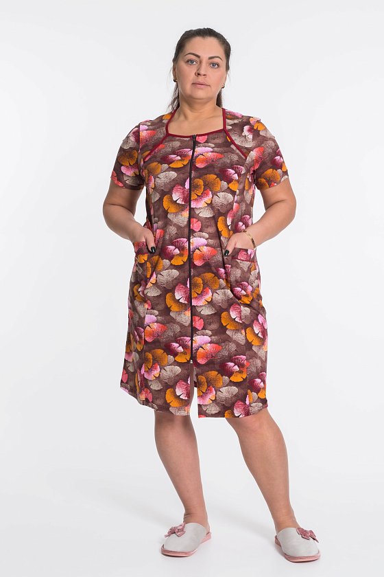 Халат выполнен из х/б полотна с набивкой. Застёжка на молнию, по бокам расположены карманы. Горловина обработана контрастной по цвету бейкой.