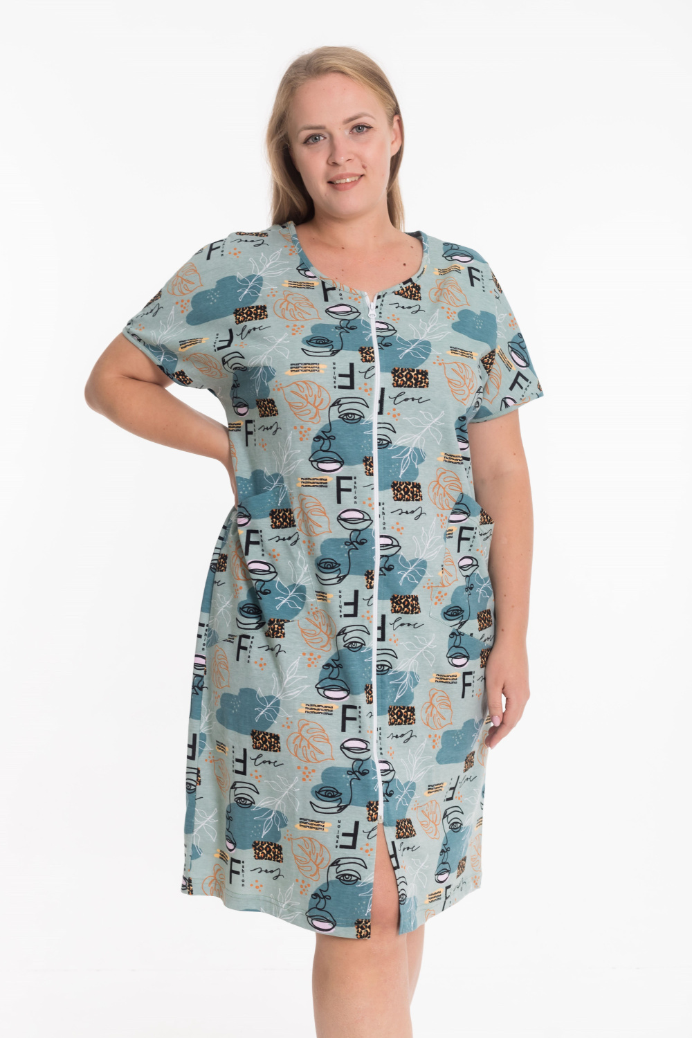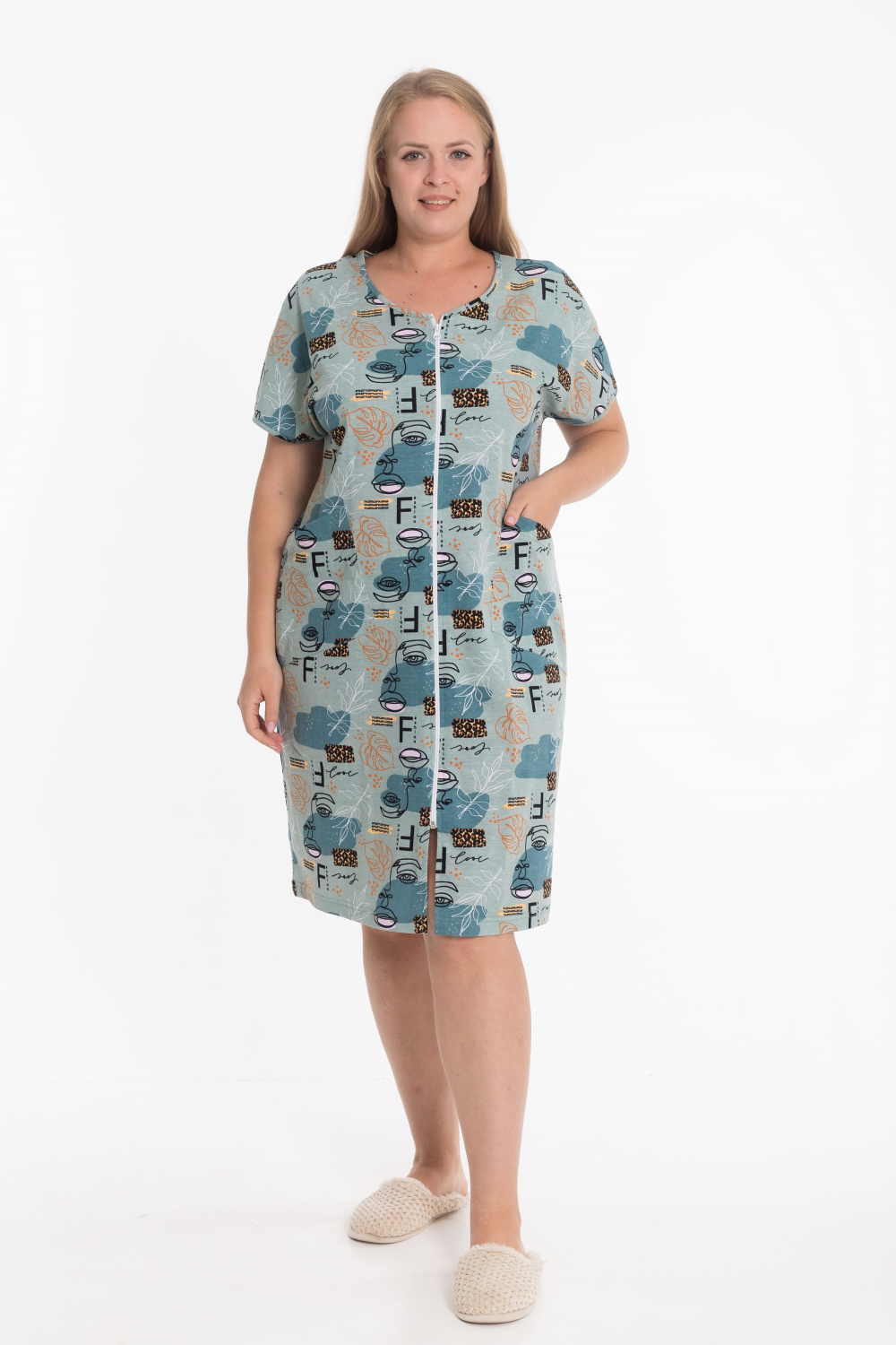 Женский халат из натурального хлопкового полотна — лёгкий, дышащий и комфортный вариант для ежедневного использования. Модель выполнена со спущенной линией плеча, что придаёт свободный и современный силуэт. Застёжка на молнии обеспечивает удобство при переодевании, а боковые карманы добавляют практичности. Халат отлично подойдёт для дома, отдыха и повседневного комфорта.