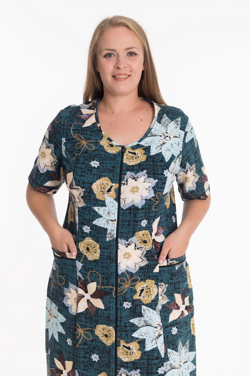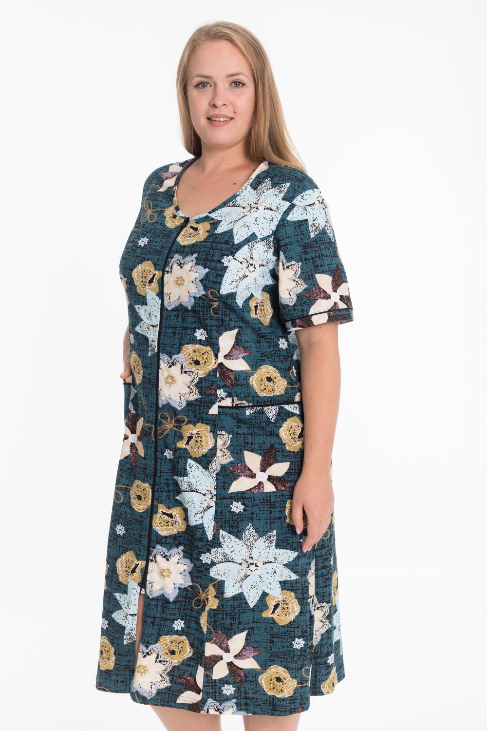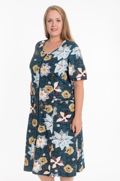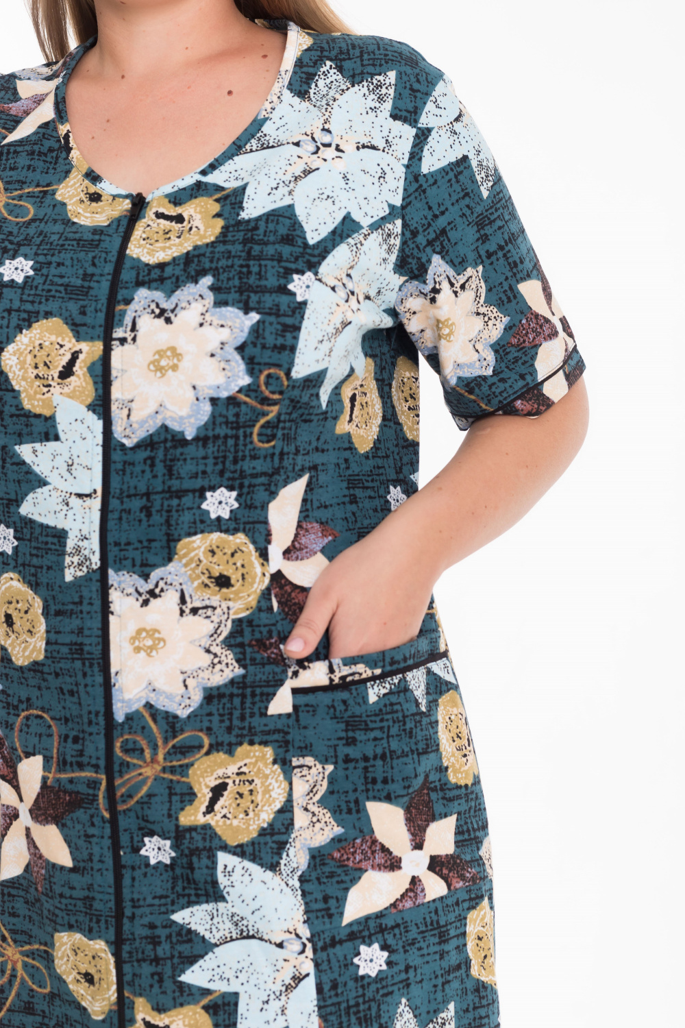 Женский халат из кулирки с набивным рисунком — удобная и практичная модель для дома. Изделие выполнено с коротким рукавом и застёжкой на молнию. На спинке расположен средний шов, обеспечивающий хорошую посадку по фигуре. Полочки оформлены рельефными линиями, между которыми и боковыми швами расположены накладные карманы. В швах притачивания планок рукавов и карманов вставлен кант, придающий халату аккуратный и стильный вид.
