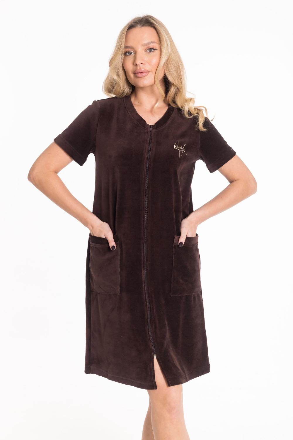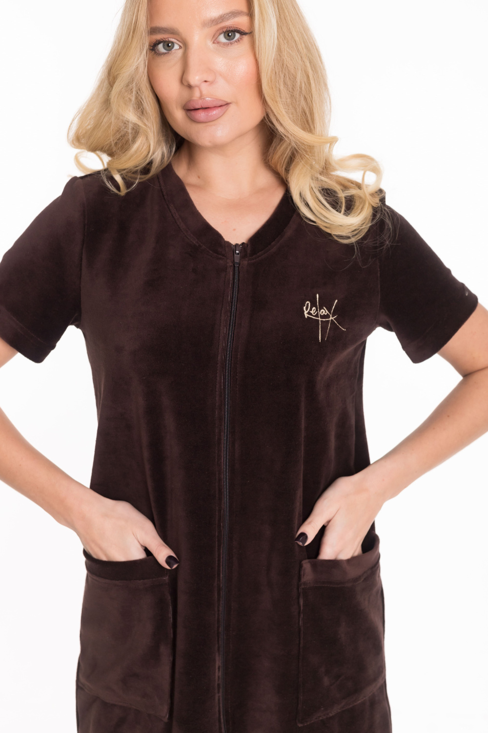 Халат имеет прямой крой и застёгивается на замок. V-образный вырез горловины придаёт изделию стильный вид. Короткий рукав обеспечивает свободу движений.