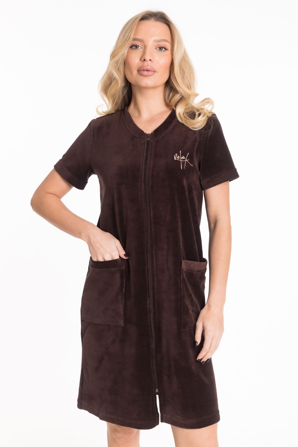 На левой полочке халата расположена вышивка в тон основного цвета, которая добавляет изюминку в дизайн. Накладные карманы придают модели функциональность.