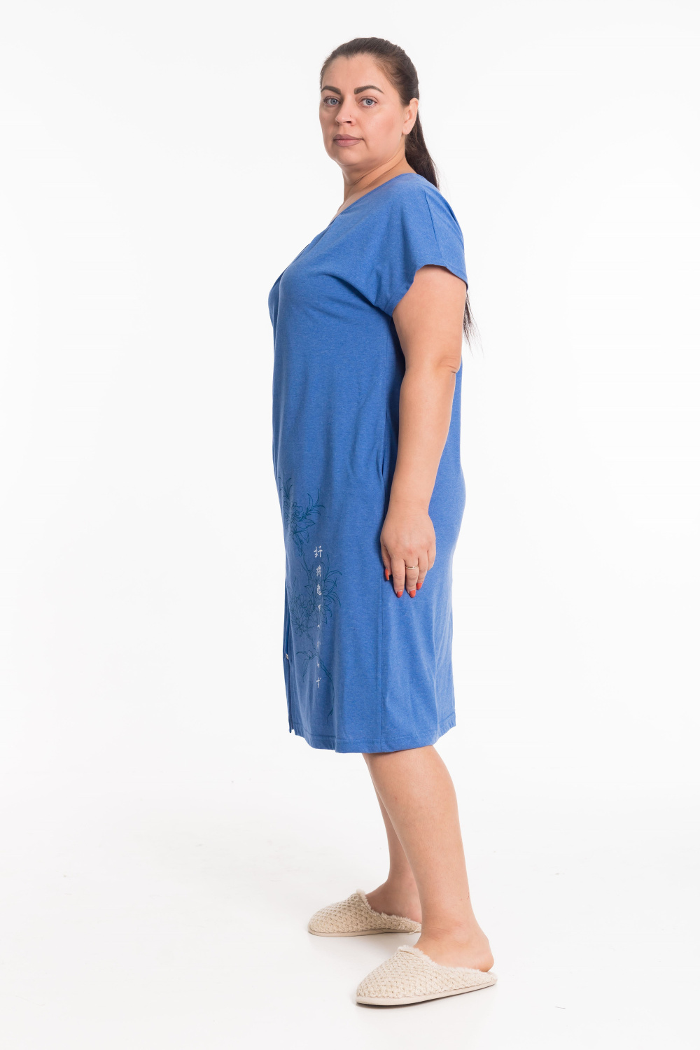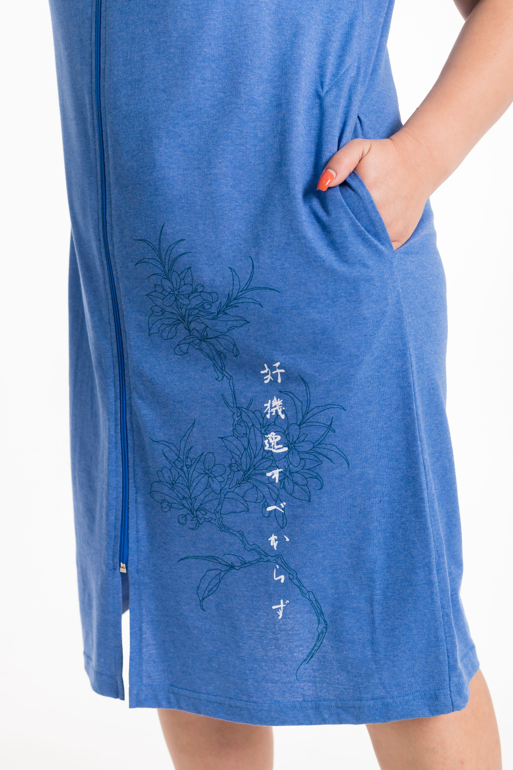 Женский халат выполнен из кулирного хлопкового полотна, что обеспечивает комфорт и удобство в носке. Модель со спущенной линией плеча, застежкой на молнии и двумя карманами в боковых швах. Горловина обработана бейкой и украшена декоративными защипами. Спереди внизу расположен стильный принт, добавляющий образу оригинальности.
