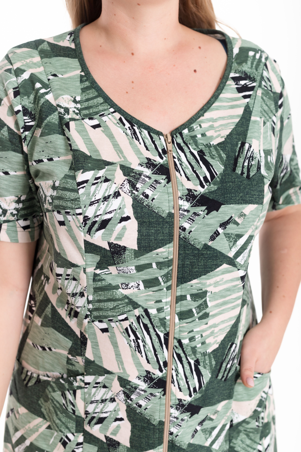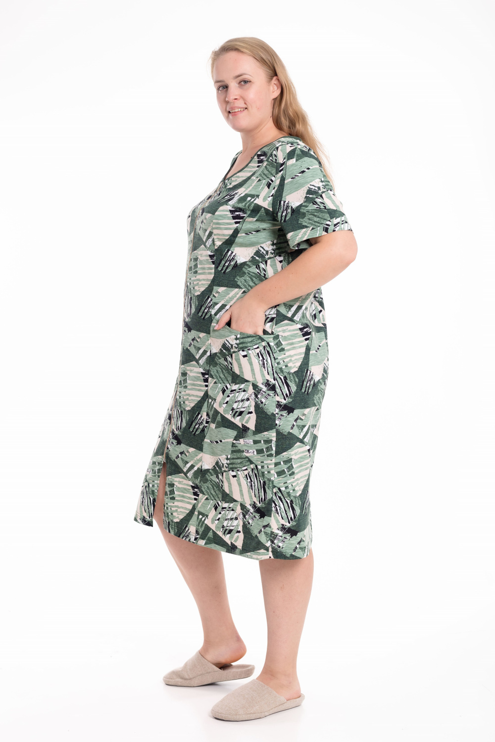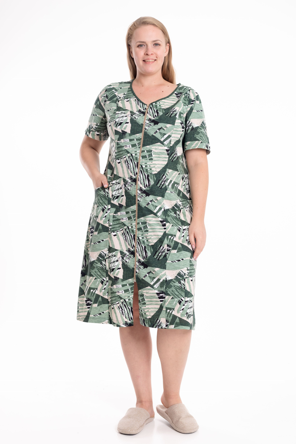 Женский халат из кулирки с набивным рисунком — практичный и удобный вариант для дома. Модель прямого кроя с короткими рукавами и круглым вырезом горловины подчёркивает женственность и обеспечивает свободу движений. Застёжка на молнии делает халат удобным в использовании, а накладные карманы добавляют функциональности. Контрастная бейка по горловине и бортам служит стильным акцентом. Натуральное хлопковое полотно приятно к телу и дарит комфорт в течение всего дня.