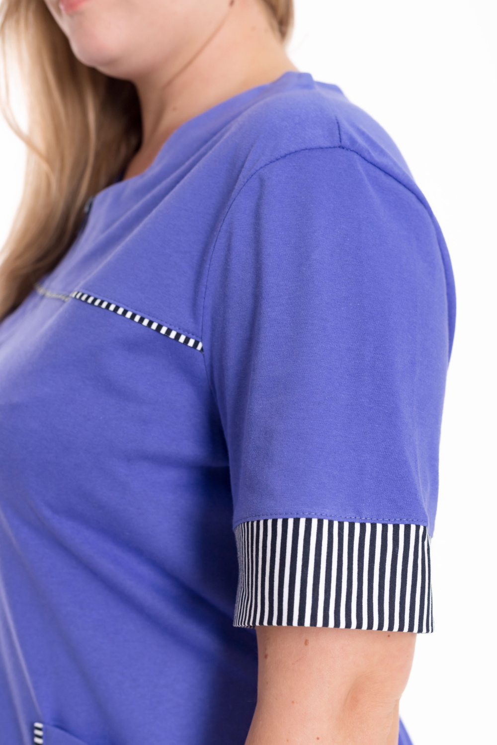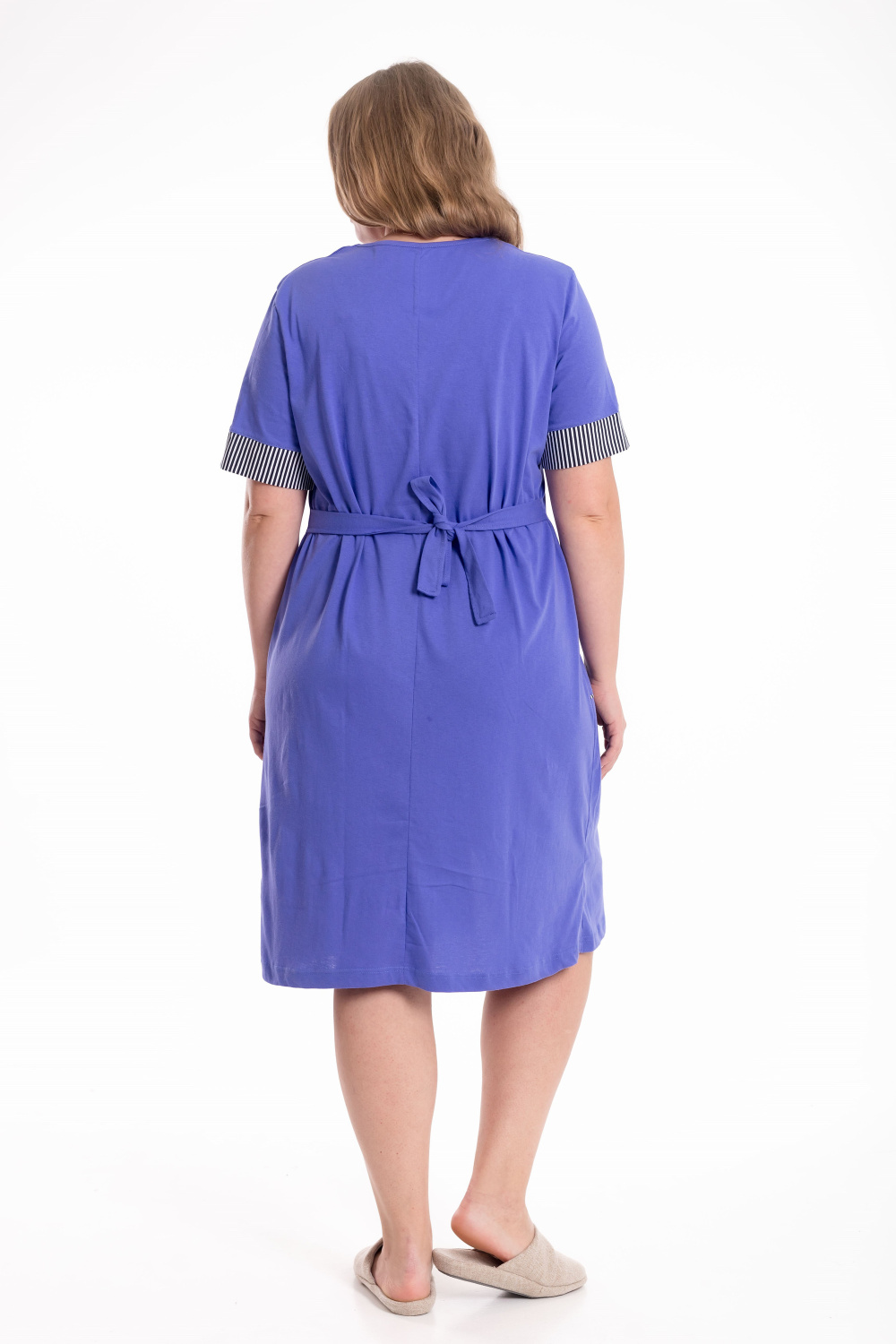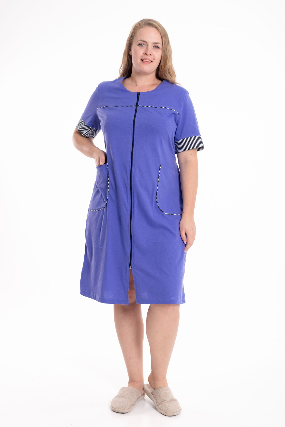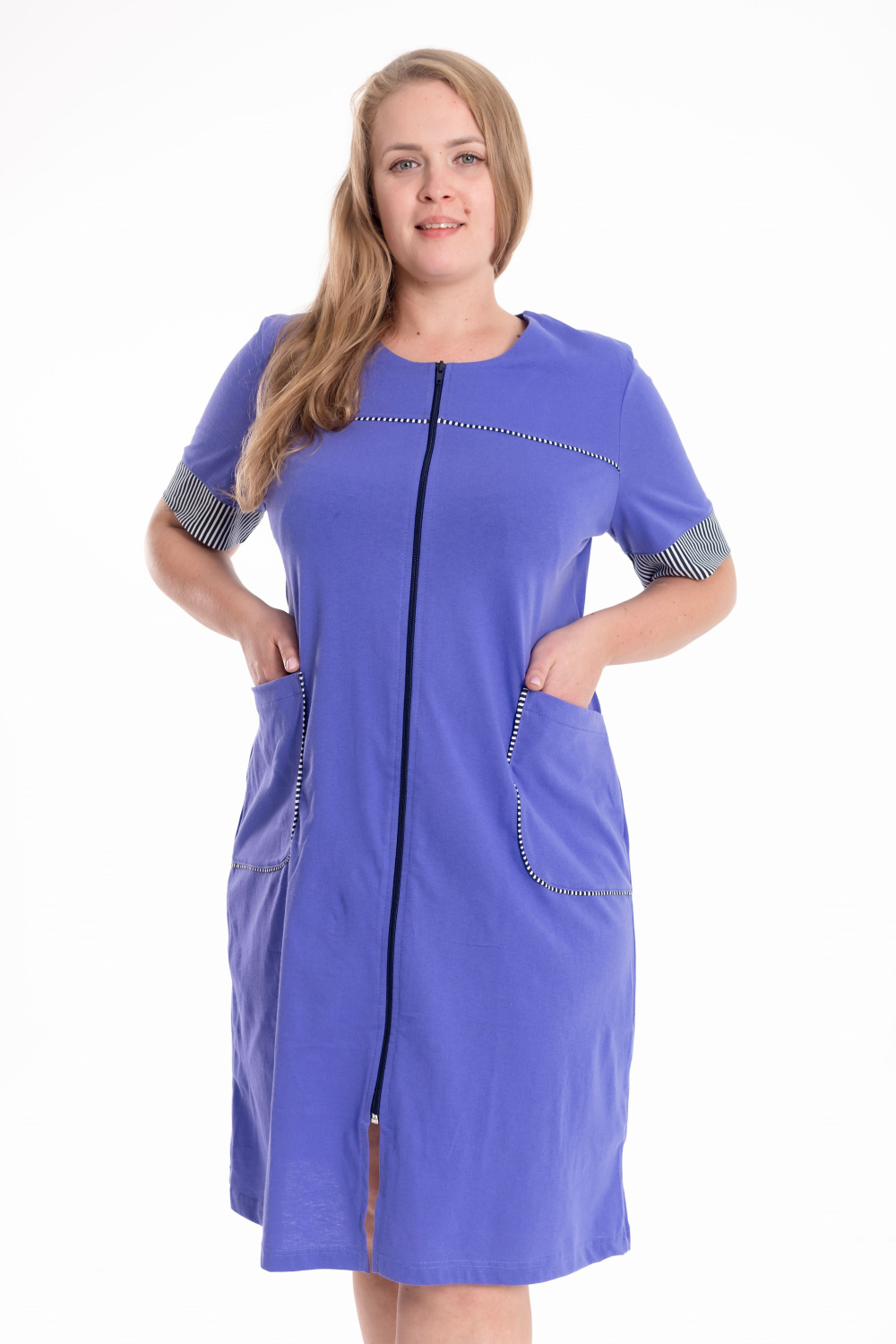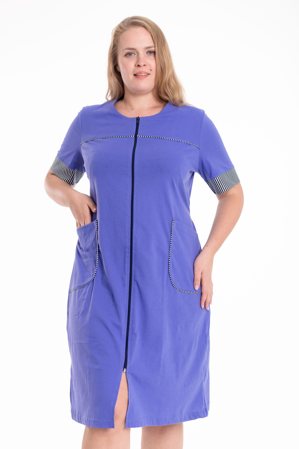 Халат из однотонной кулирки со вставками из отделочного полотна в полоску сочетает в себе комфорт и элегантность. Модель с коротким втачным рукавом и манжетой выполнена в классическом крое. Застёжка на молнии обеспечивает удобство в использовании. Спереди расположены кокетки и накладные карманы, декорированные контрастным кантом. Длина халата чуть ниже колена, на спинке предусмотрен завязывающийся хлястик, подчёркивающий талию и создающий аккуратный силуэт.
