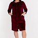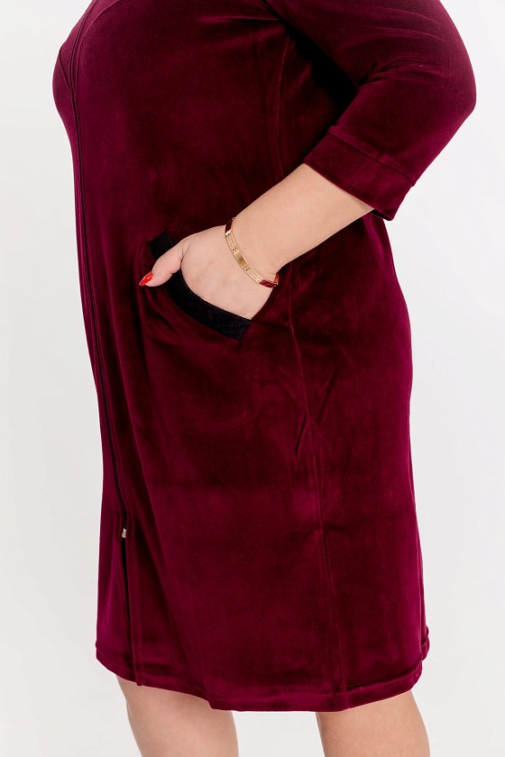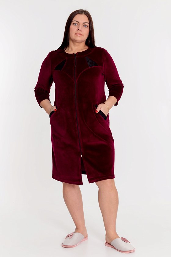 Халат из однотонного велюра с рукавом длиной 3/4, центральной застежкой на молнию и карманами. На планках карманов и средней части фигурной кокетки настрочено кружево. По горловине полочки притачная планка. Рукава с притачной манжетой.