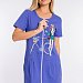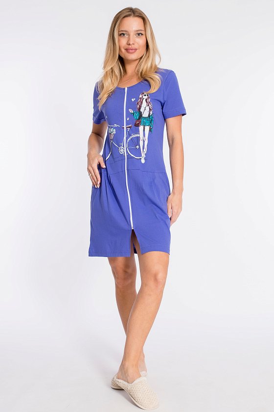 Халат на молнии выполнен из однотонной кулирки, 100% хлопок. По бокам размещены карманы, от отрезной линии талии заложены складки. Спереди нанесён красивый принт.