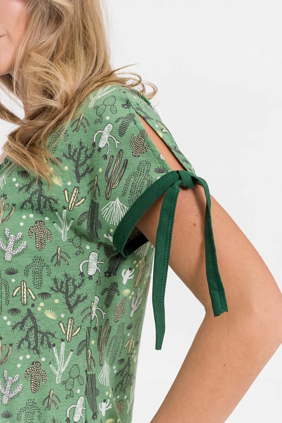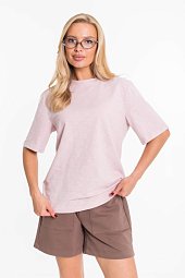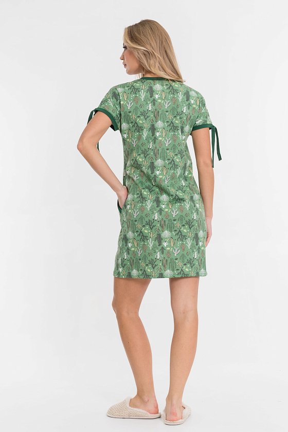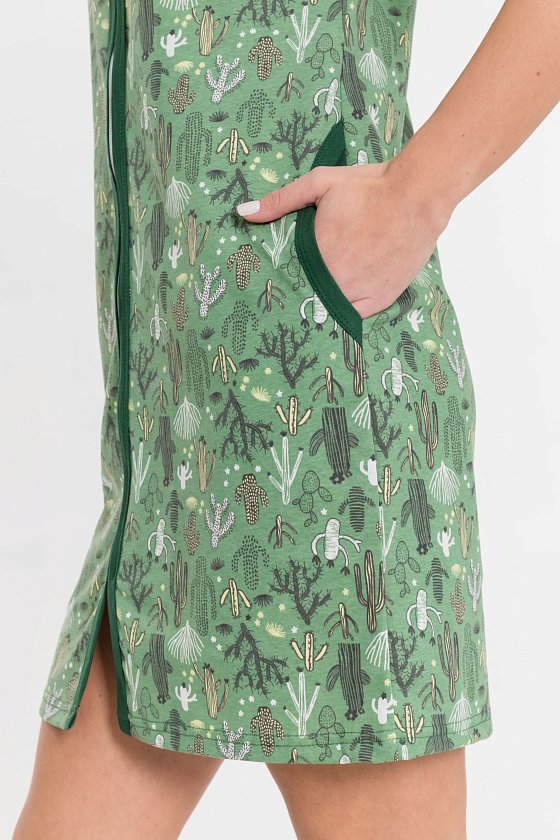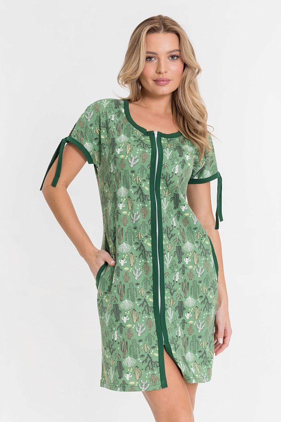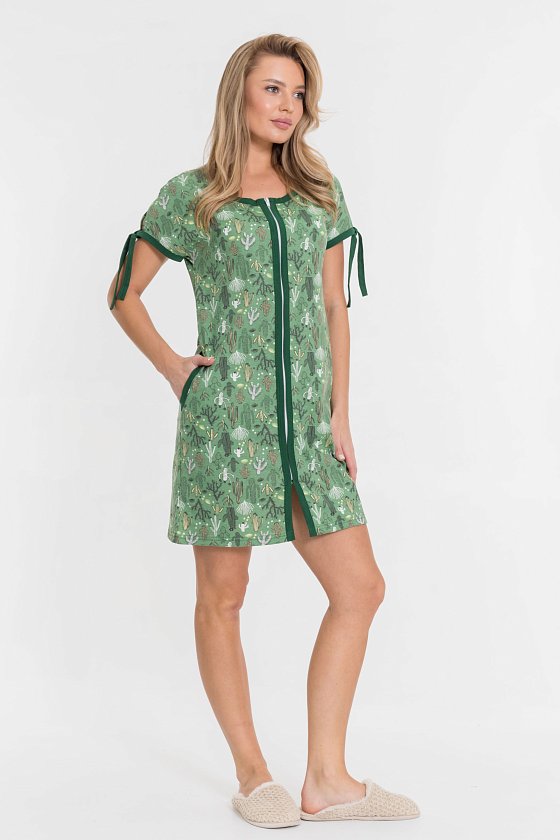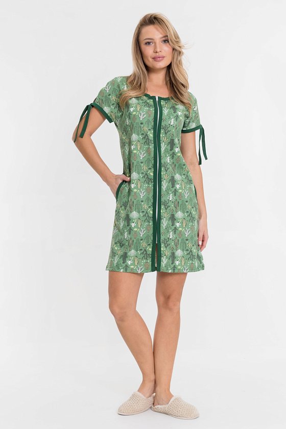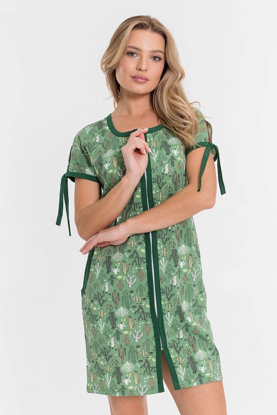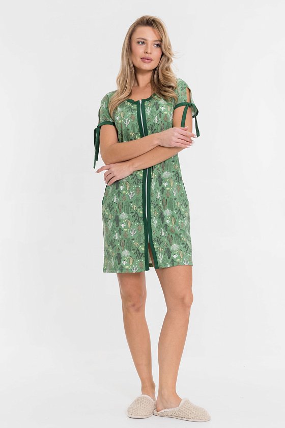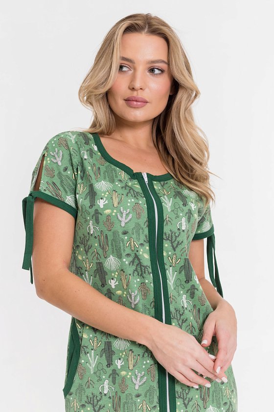 Халат из кулирки со спущенным рукавом и застёжкой на молнию. По бокам размещены карманы. На рукавах разрезы с завязками из бейки.
