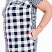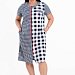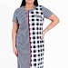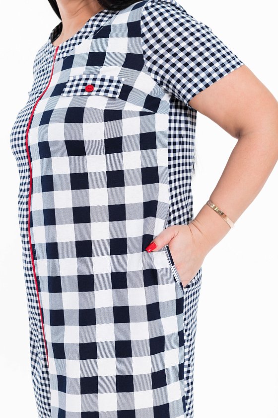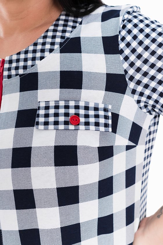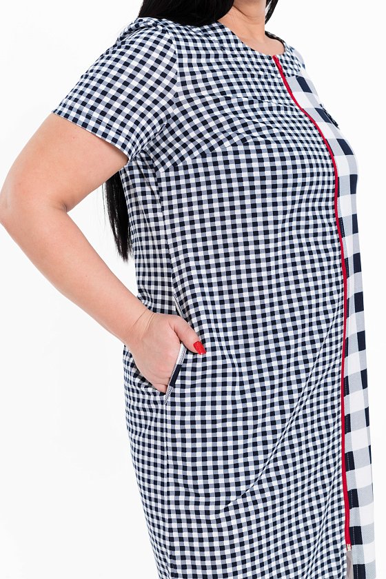 Женский халат на молнии выполнен из лёгкой хлопковой ткани с комбинацией двух расцветок-компаньонов. Рукава короткие, силуэт халата прямой, по бокам расположены карманы.