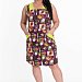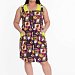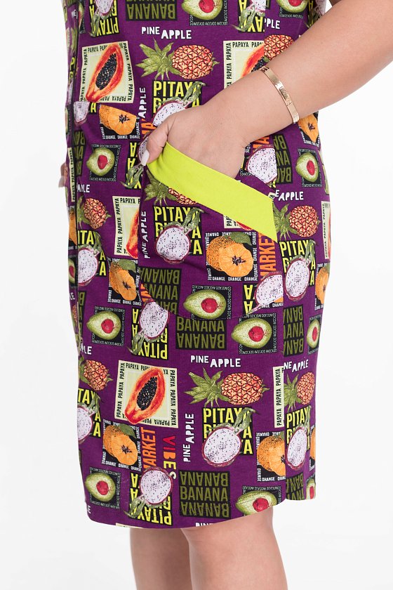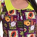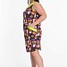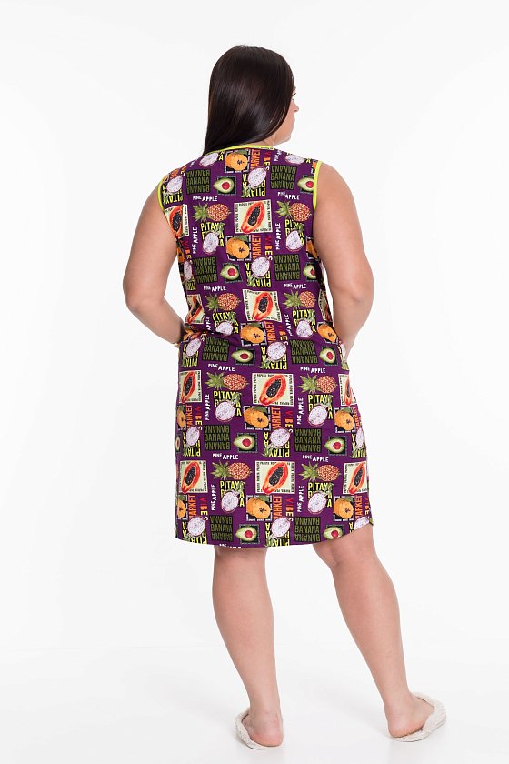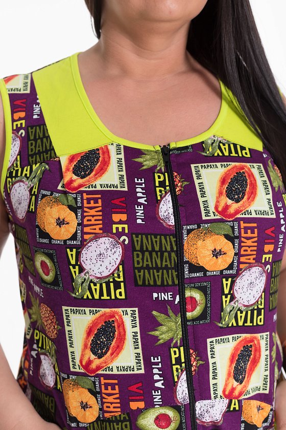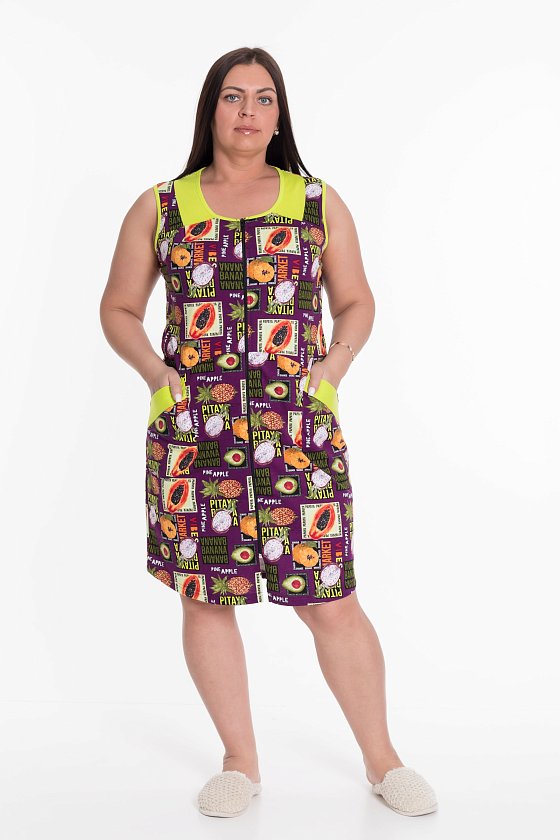Халат выполнен из хлопкового полотна с набивным рисунком с отделкой деталями из однотонного полотна, без рукавов, с центральной застёжкой на молнию. Спереди два накладных кармана.