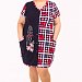 Женский халат на пуговицах выполнен из легкой хлопковой ткани с комбинацией двух расцветок. Левая полочка из однотонного полотна, с принтом. Правая полочка и спинка изделия из полотна с набивкой. Рукав короткий, горловина имеет V-образный вырез. Силуэт прямой, длина выше колена. По бокам расположены карманы. Горловина, рукава, низ изделия и вход в карманы отделаны тонкой окантовкой из полотна с набивкой.