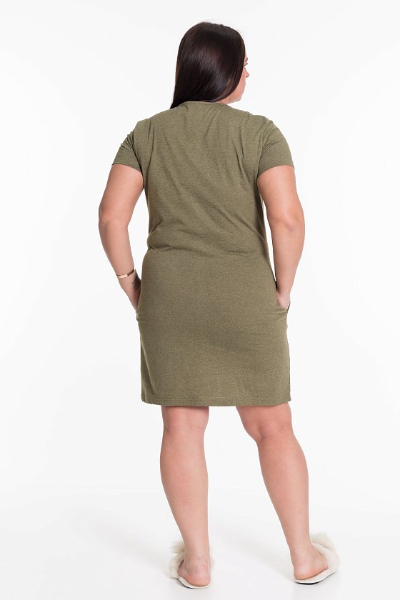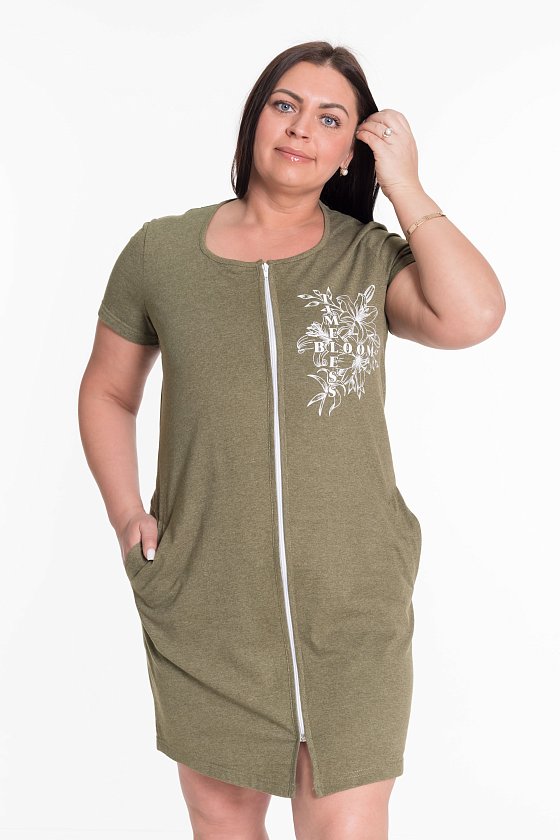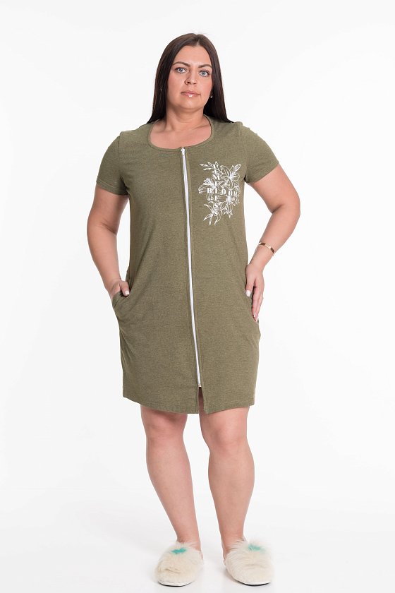 Халат из х/б полотна. На левой полочке принт, в боковых швах карманы, застежка на молнию.