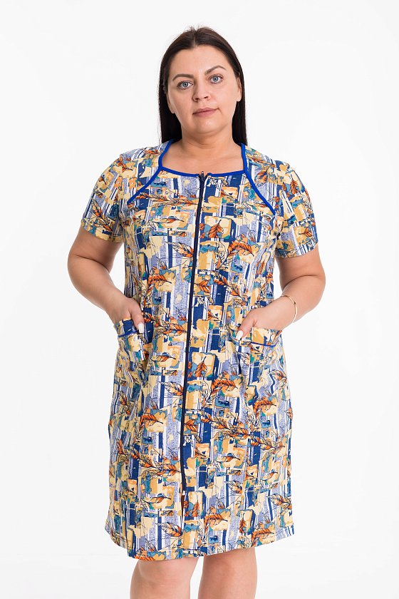 Халат выполнен из х/б полотна с набивкой. Застёжка на молнию, по бокам расположены карманы. Горловина обработана контрастной по цвету бейкой.