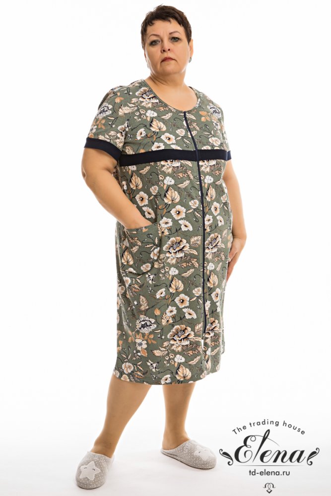Халат выполнен из кулирки с набивным рисунком, 100% хлопок. Спереди халат застёгивается на пуговицы и дополнен аккуратным отложным воротником. Втачной рукав длиной 3/4 с манжетами. С левой стороны расположен нагрудный карман. Тёмный кант по краю воротника, бортам, манжетам и карману подчёркивает линии изделия и добавляет выразительности.