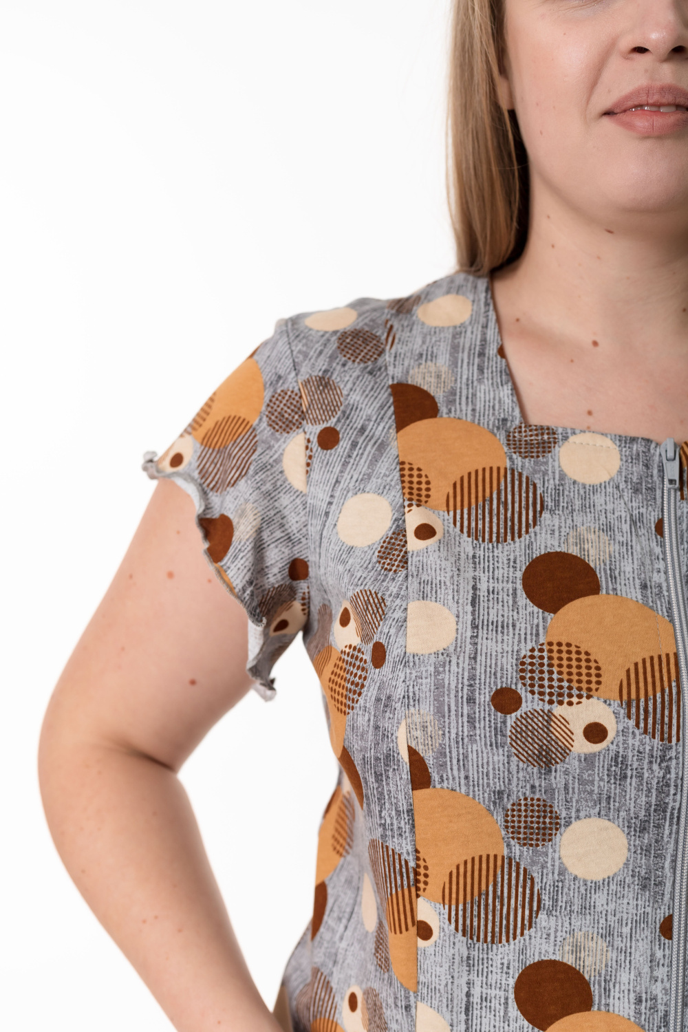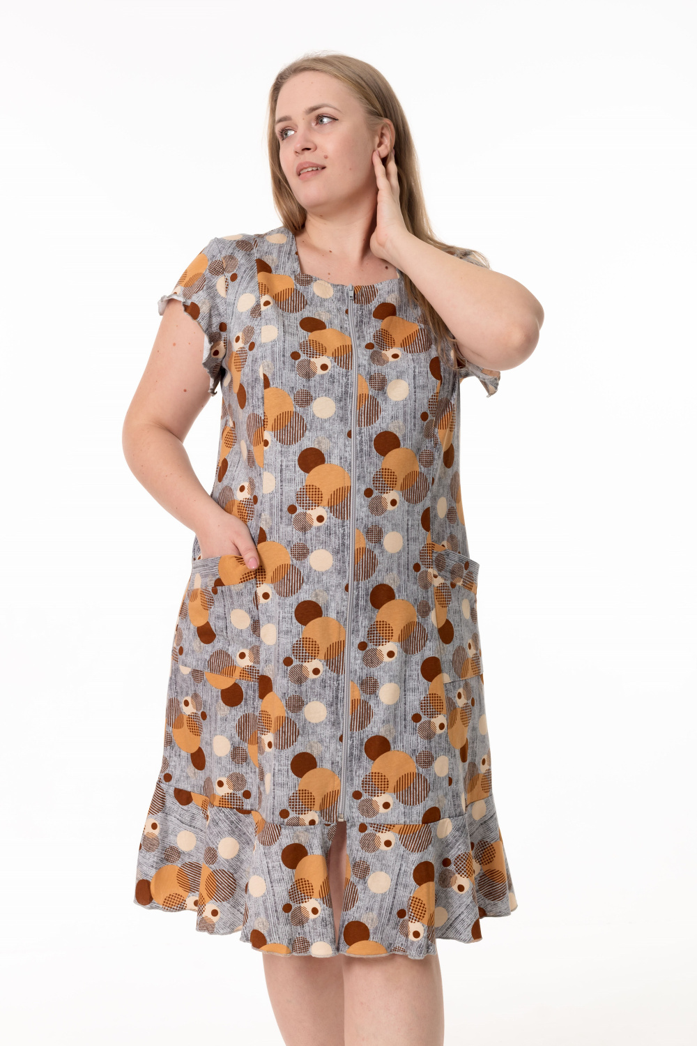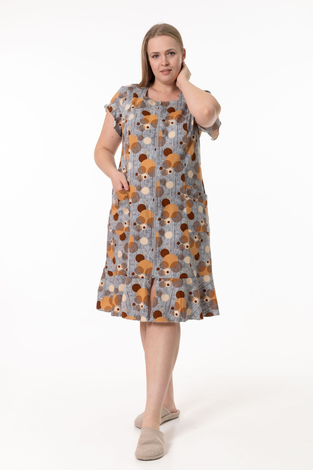 Халат выполненный из набивной кулирки с застежкой на молнию — женственная и практичная модель для дома. Рукав-волан и воланы по низу халата создают романтичный силуэт. Горловина имеет форму неширокого каре. Спинка выполнена со средним швом, на полочках — рельефные швы от плеча. По бокам расположены карманы с планкой, обеспечивающие удобство в использовании.