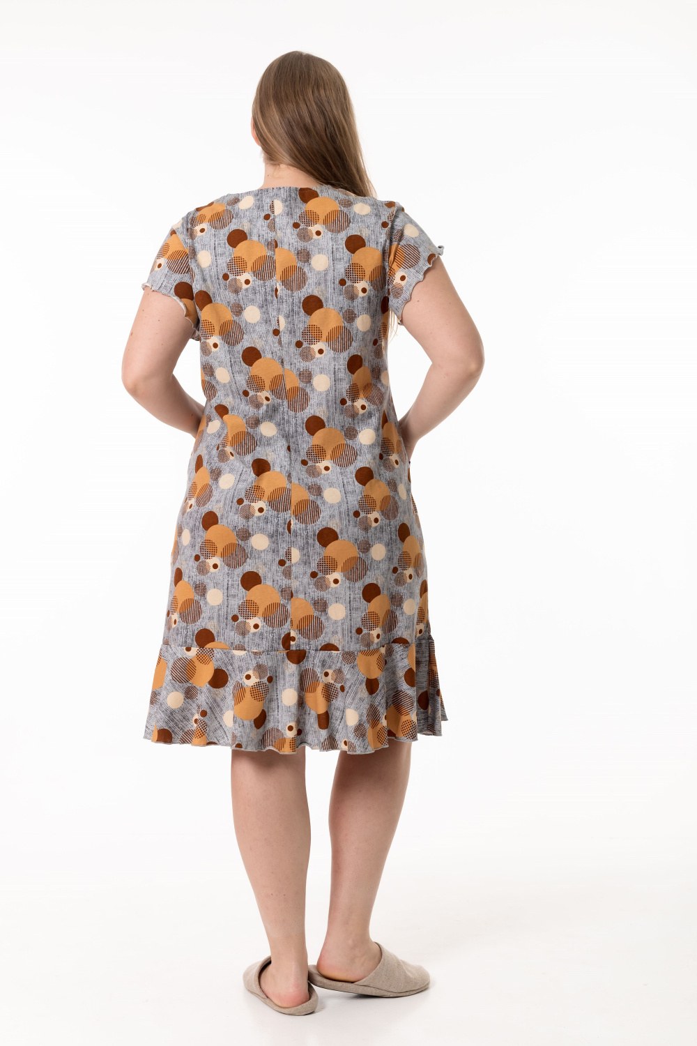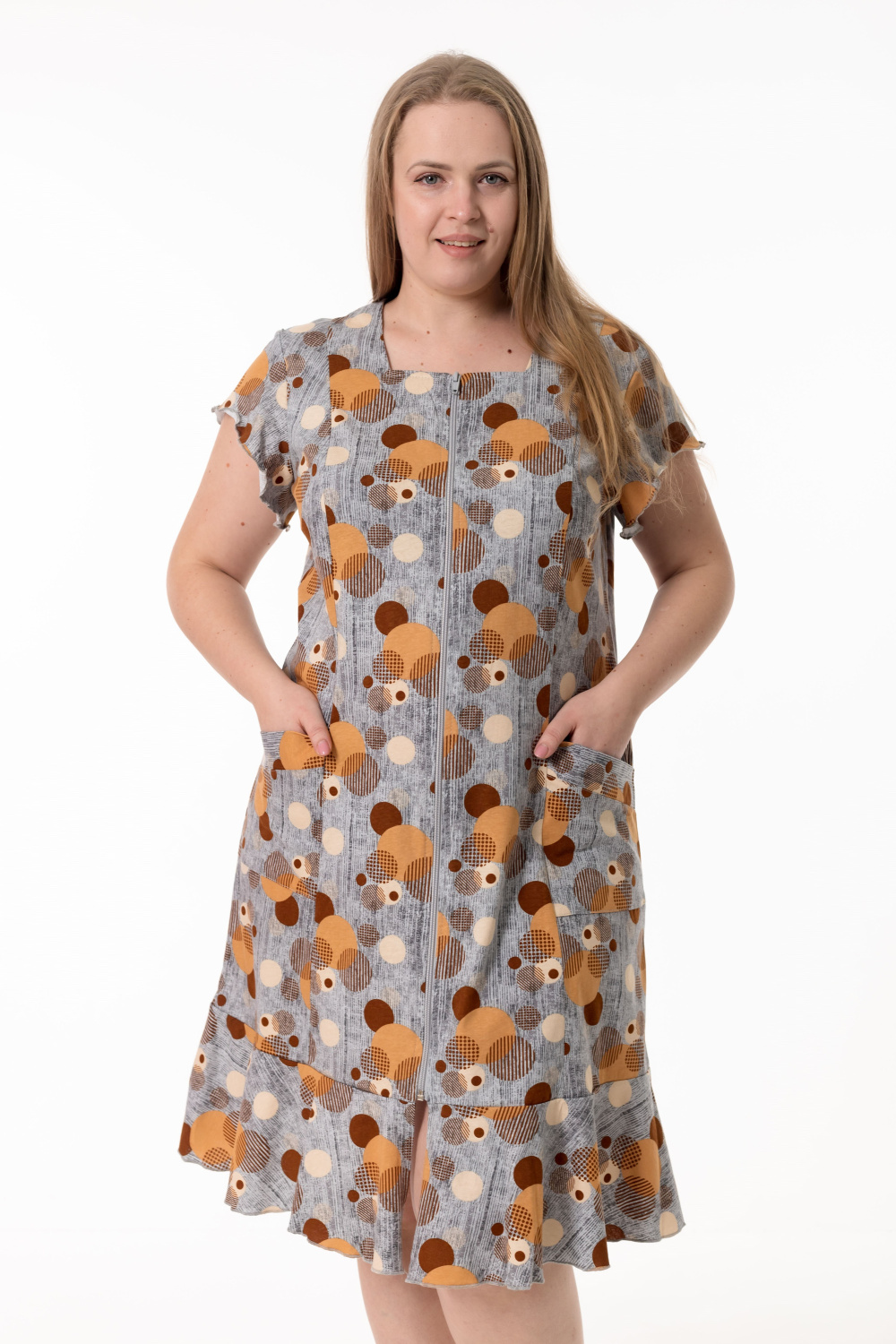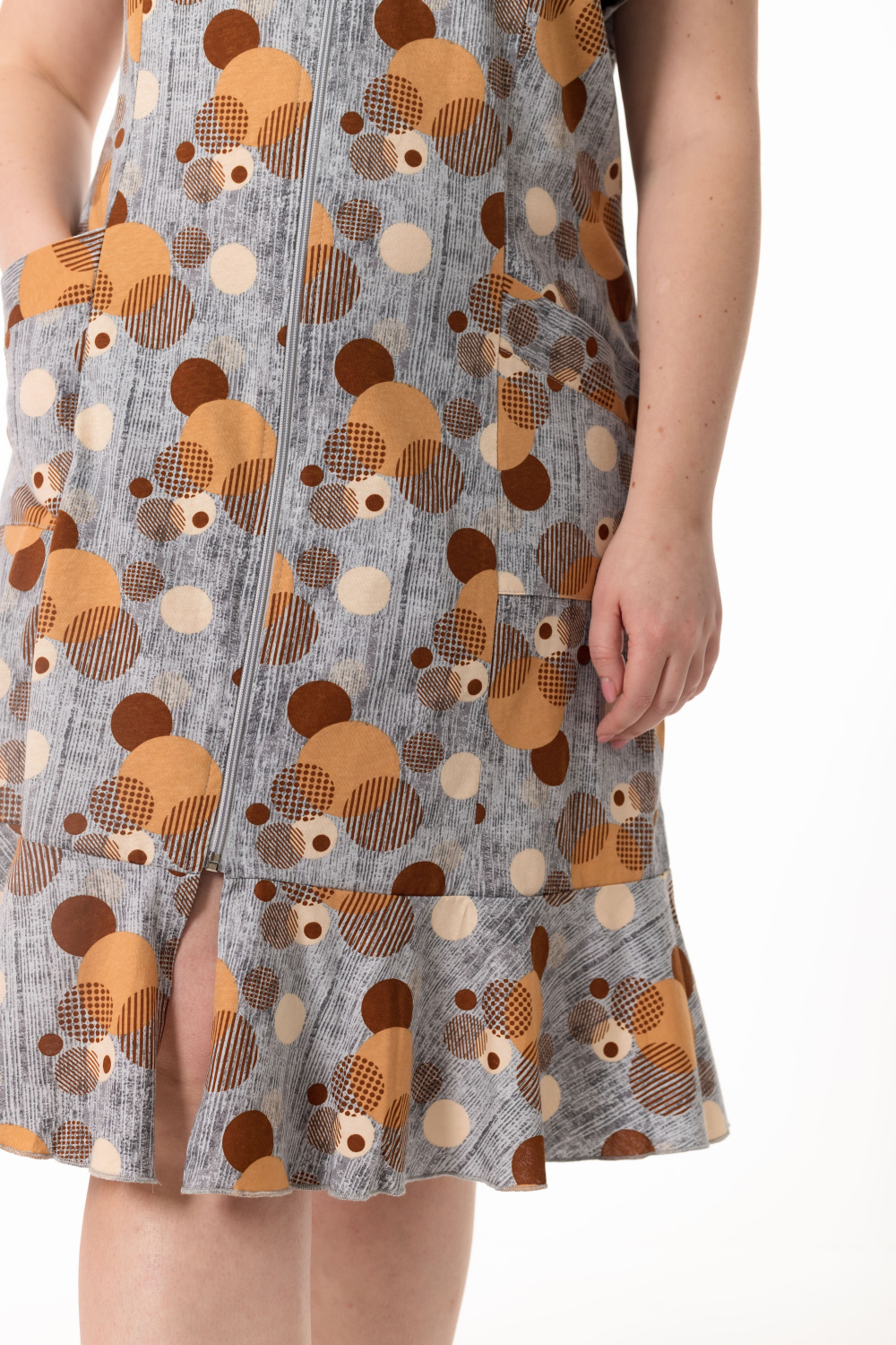 Халат выполненный из набивной кулирки с застежкой на молнию — женственная и практичная модель для дома. Рукав-волан и воланы по низу халата создают романтичный силуэт. Горловина имеет форму неширокого каре. Спинка выполнена со средним швом, на полочках — рельефные швы от плеча. По бокам расположены карманы с планкой, обеспечивающие удобство в использовании.