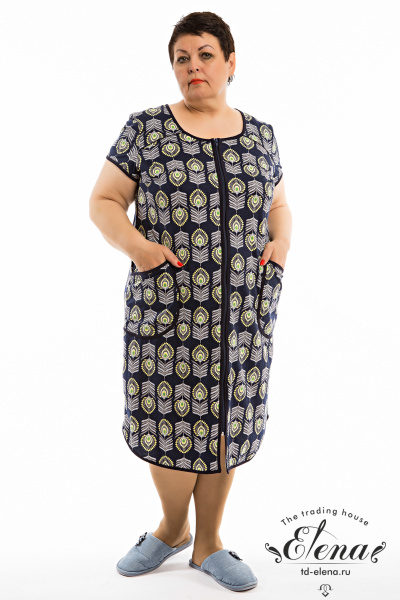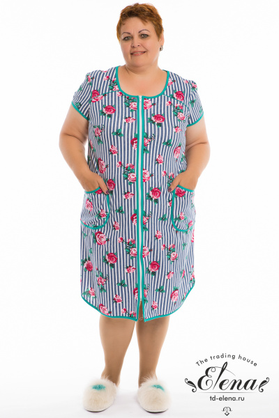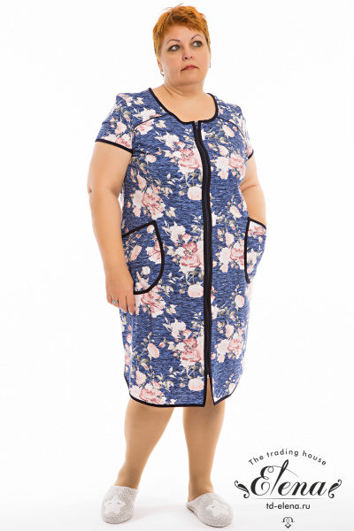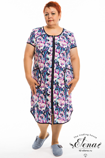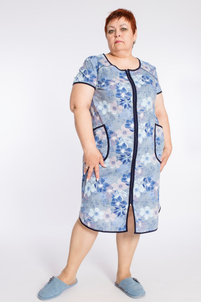 Халат с коротким рукавом выполнен из кулирки с набивкой. Центральная застёжка на молнию. Спереди расположены накладные карманы. Горловина, рукава, низ и борта халата обработаны отделочной бейкой.
