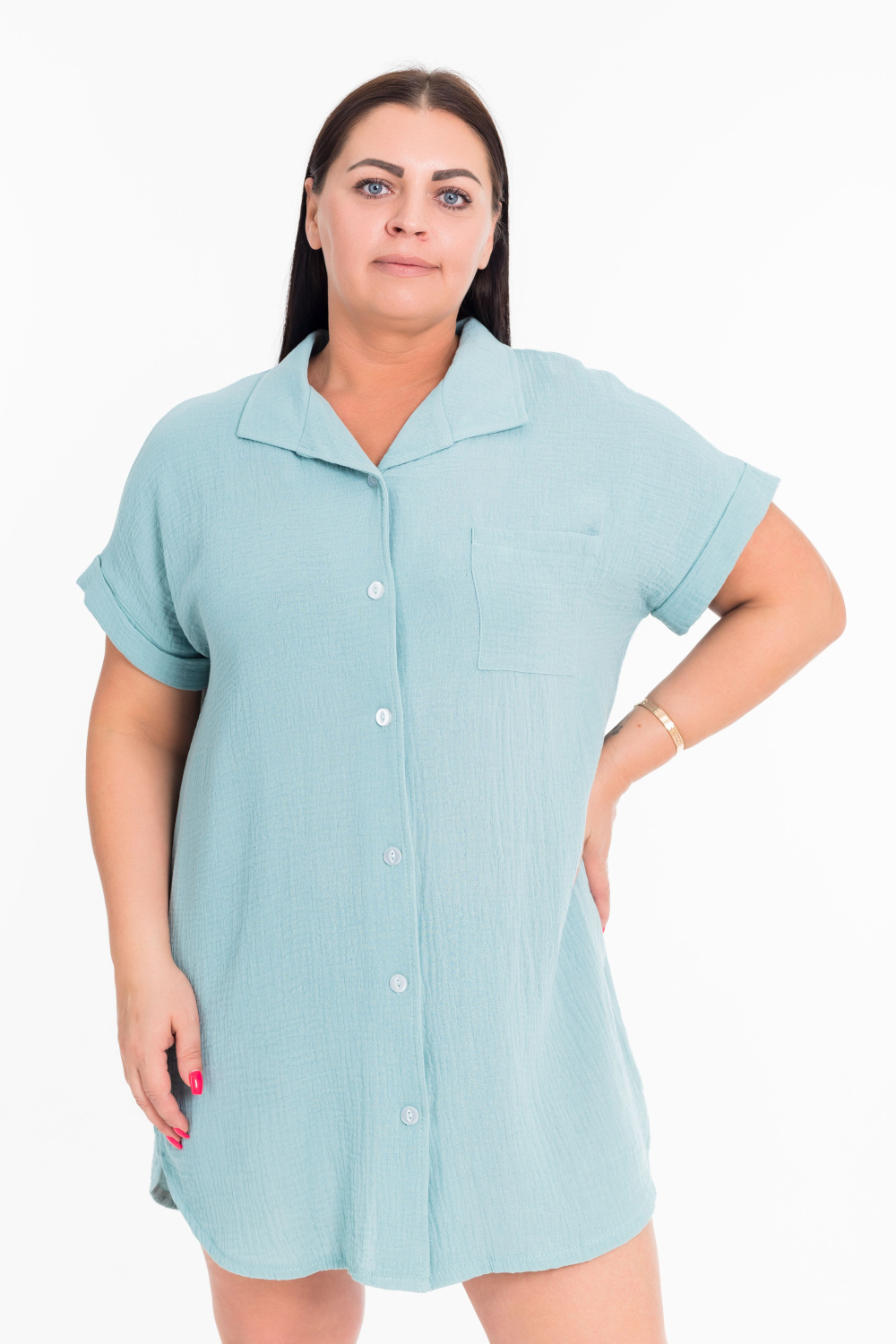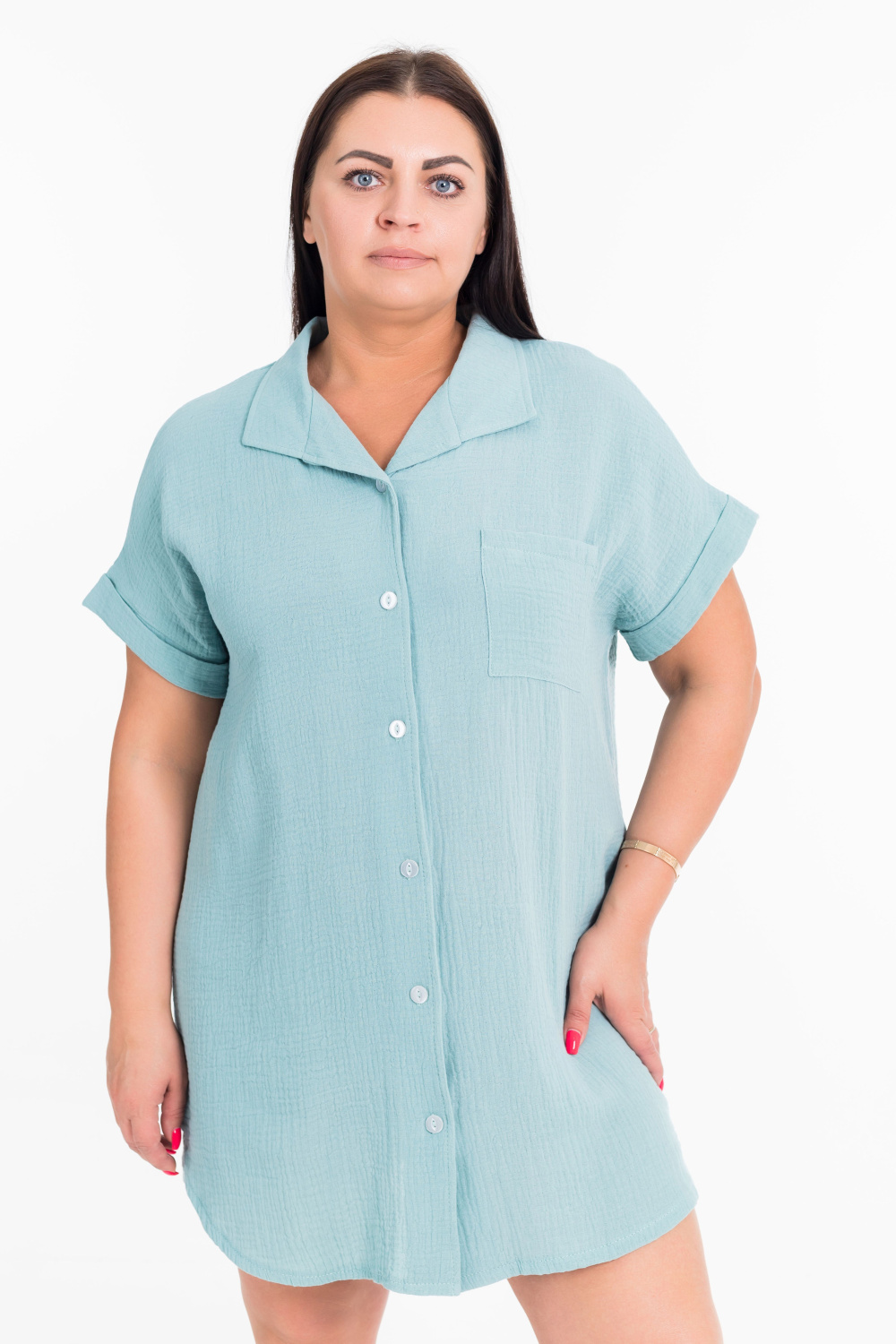 Женский халат на пуговицах выполнен из муслина. Халат свободного силуэта, короткий, со спущенной линией плеча, рукава оформлены притачной планкой, которая отворачивается налицо. С левой стороны настрочен карман, внизу по бокам декоративные разрезы.