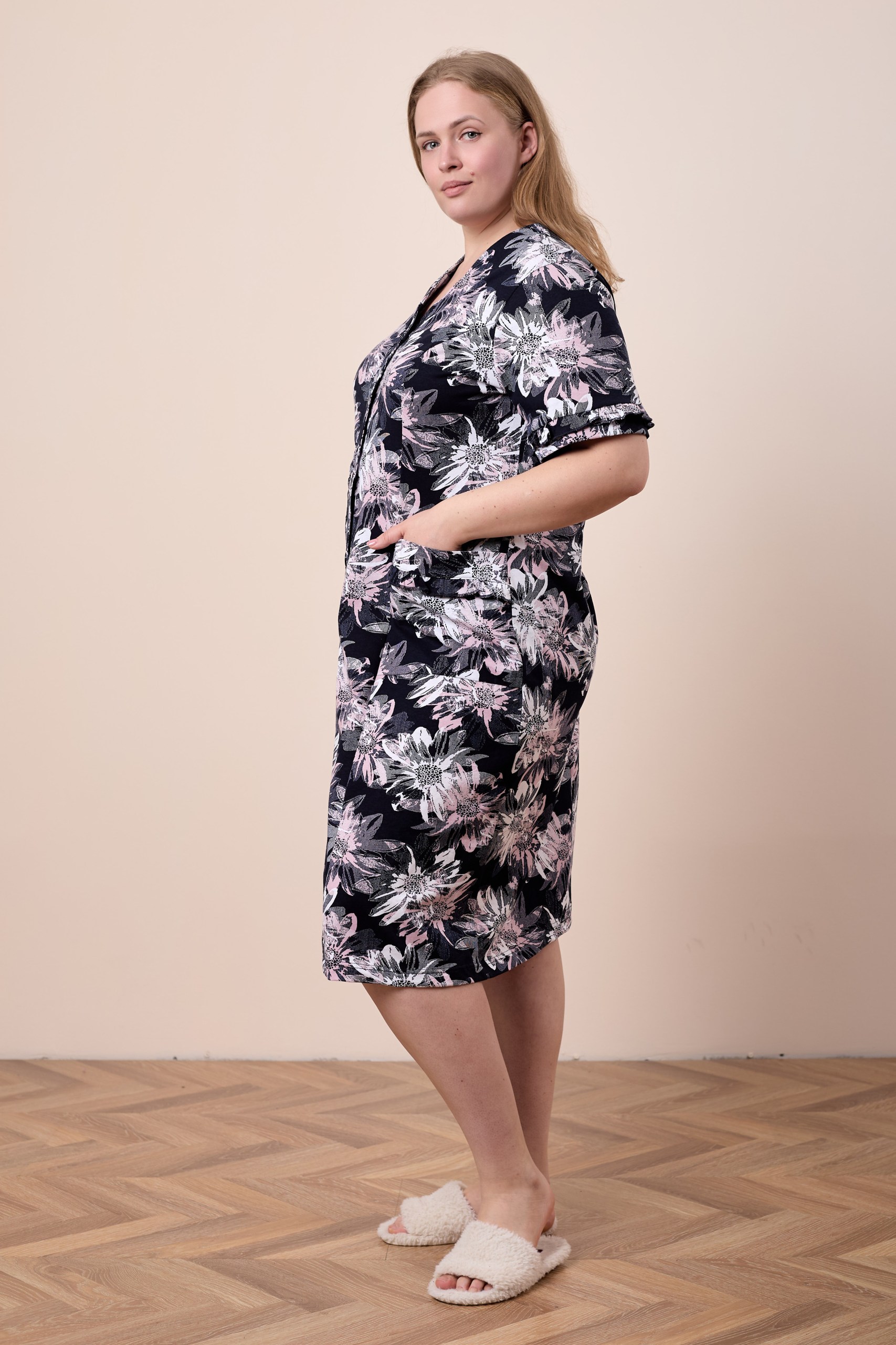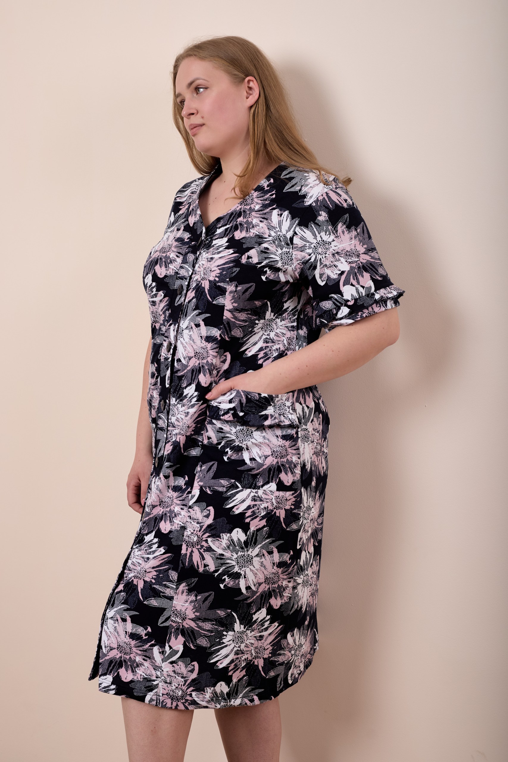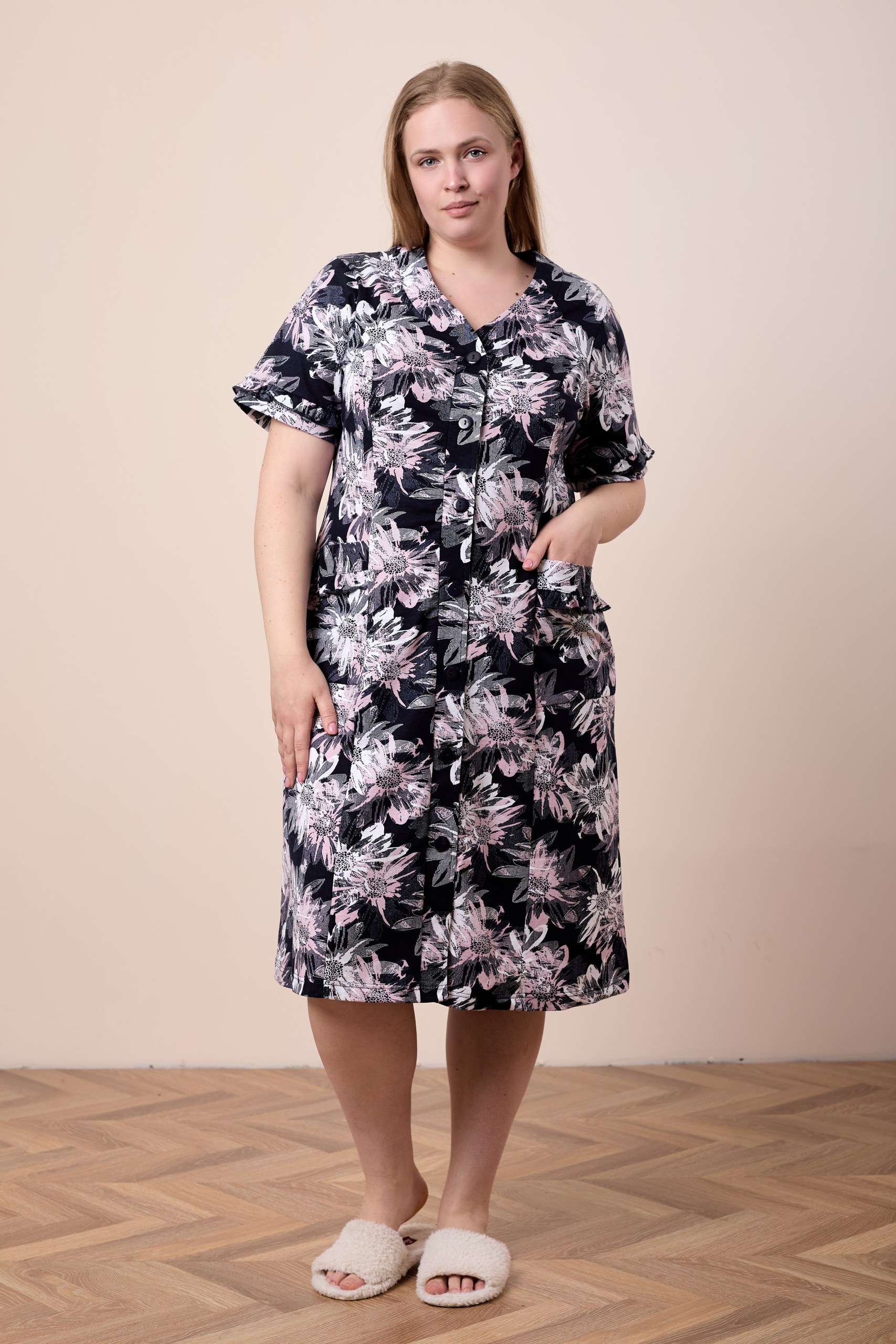 Халат выполнен из мягкого хлопкового полотна и станет комфортным вариантом для домашнего отдыха и повседневной носки. Модель с коротким рукавом имеет центральную застёжку на пуговицы, что делает её удобной и практичной. Спереди расположены накладные карманы, а рюши на рукавах и карманах служат изящной отделкой, придавая халату нежный и аккуратный вид.