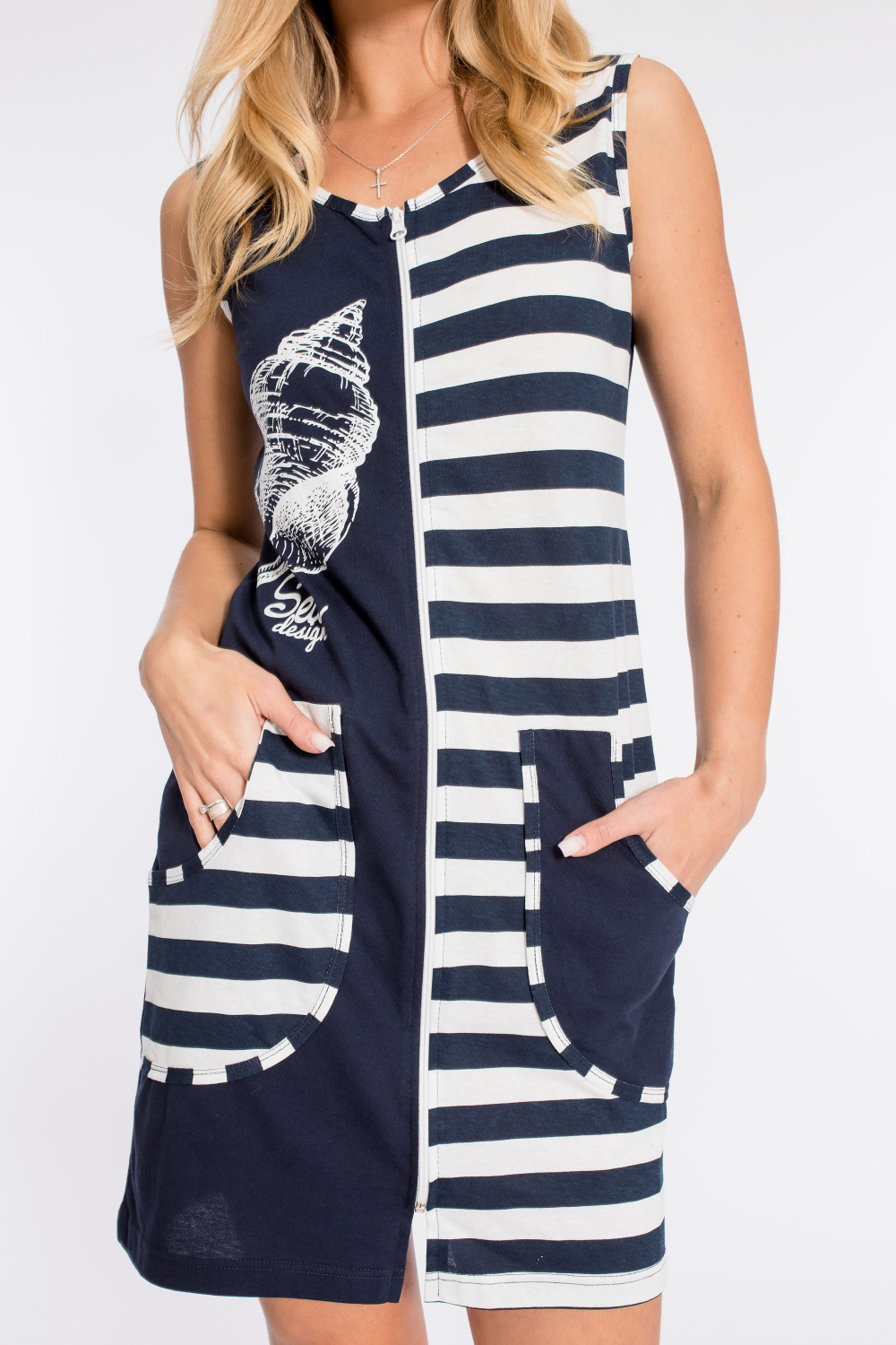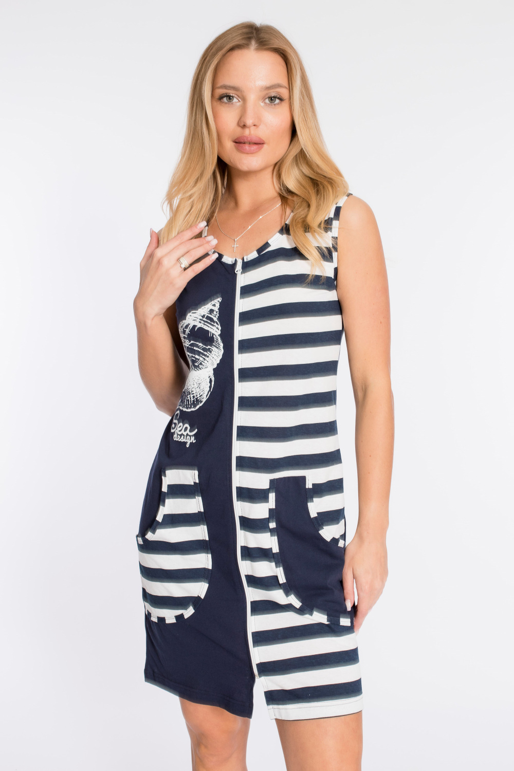 Халат выполнен из хлопковой ткани комбинированных расцветок. Справа нанесён оригинальный принт. Халат без рукавов, с карманами спереди и центральной застежкой на молнию.