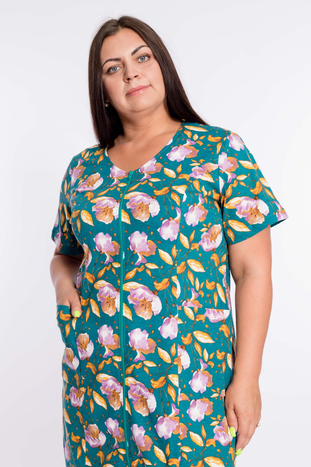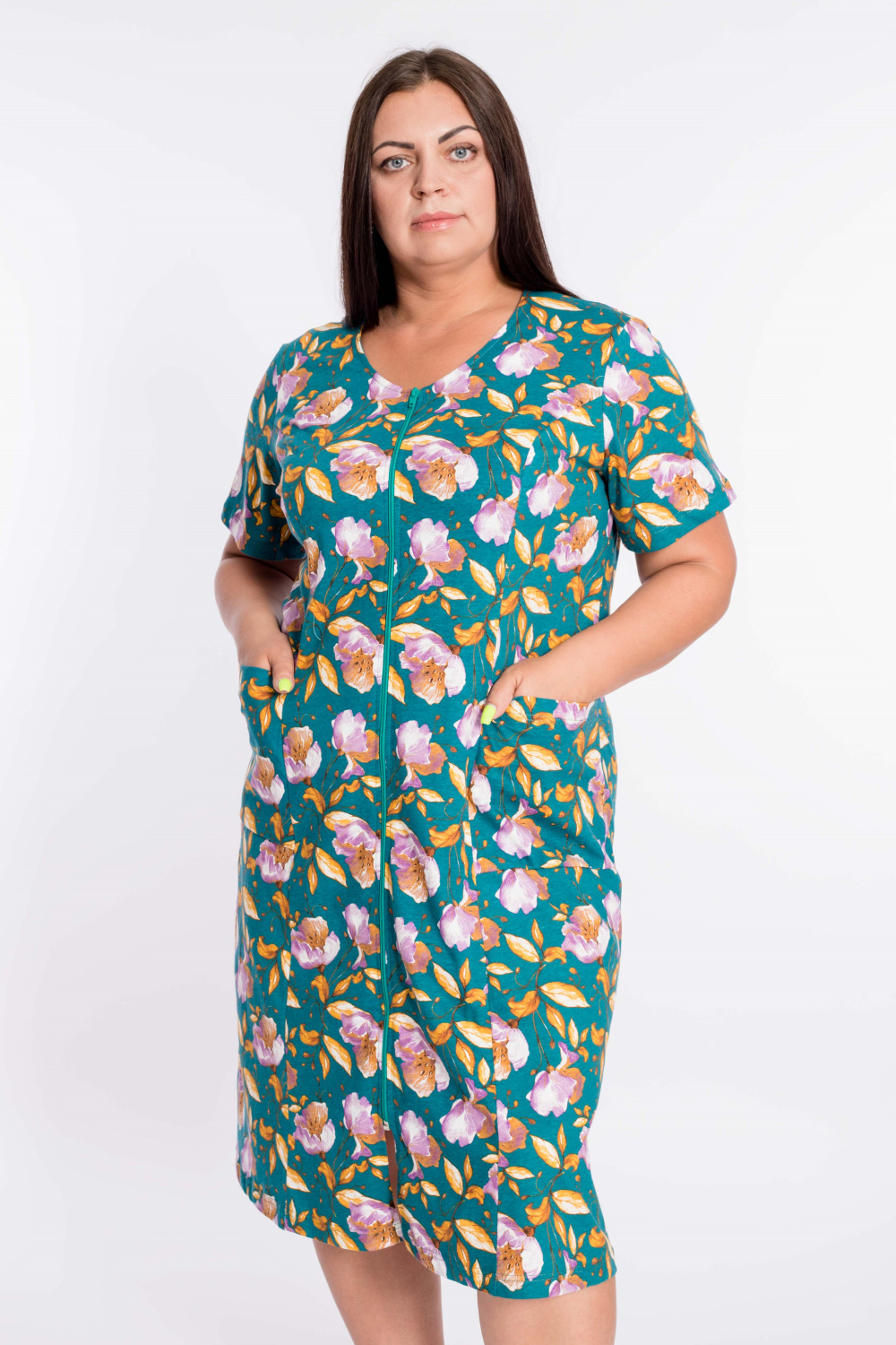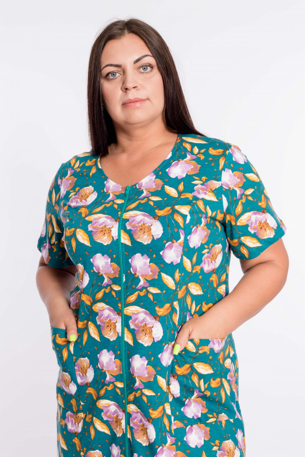 Халат выполнен из хлопкового полотна различных расцветок. Центральная застёжка на молнию, короткий рукав. По бокам расположены карманы.
