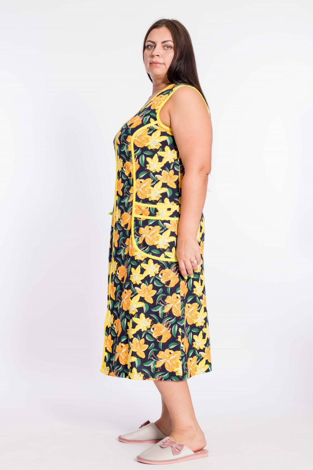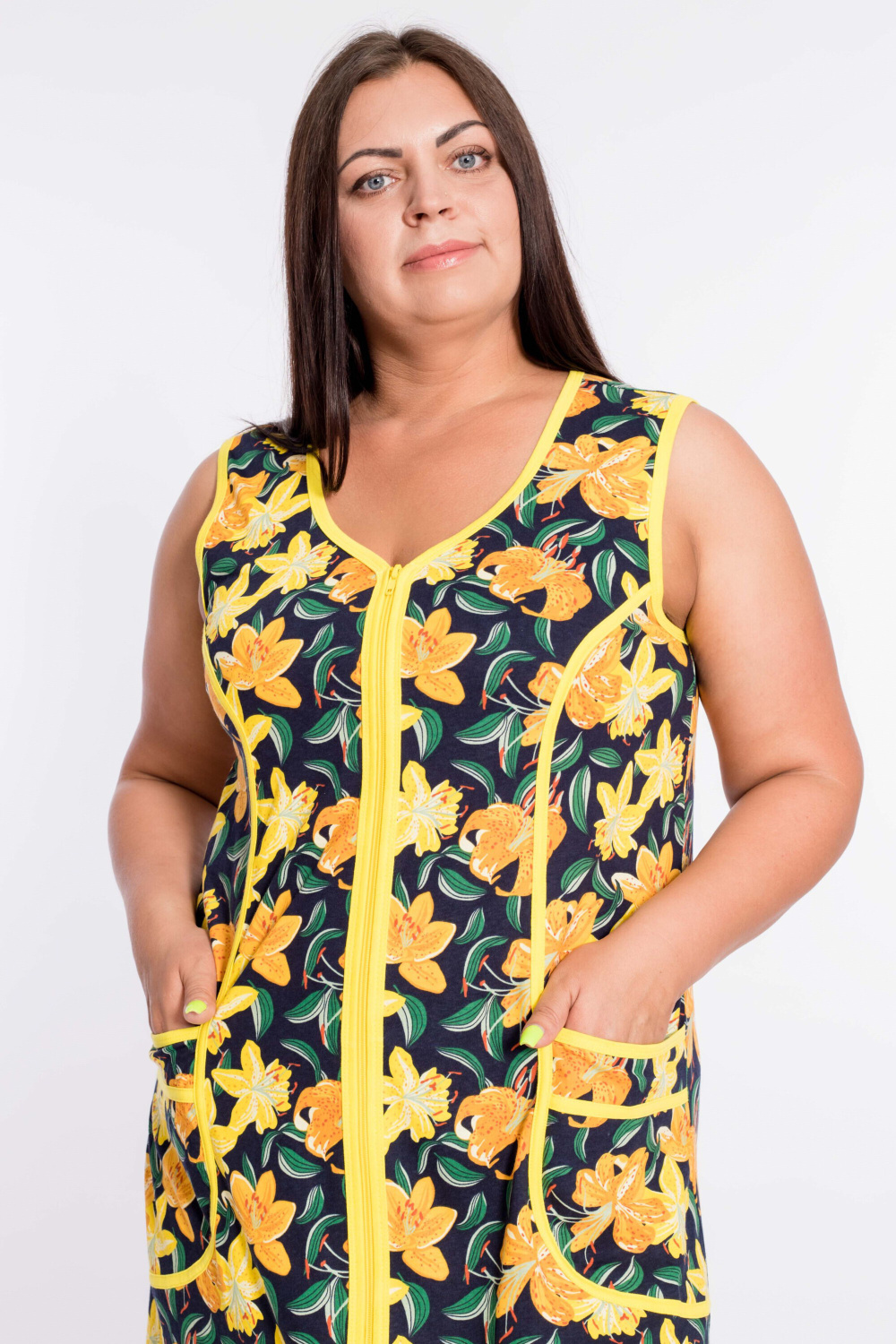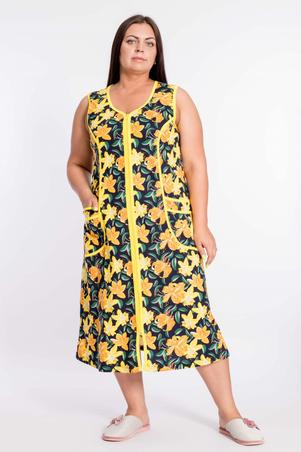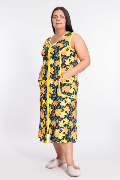 Халат с центральной застёжкой на молнию выполнен из кулирки. Силуэт приталенный, на спинке и полочке с рельефами, спереди по рельефам в качестве отделки настрочены лампасы. Халат удлинённного покроя идеален для повседневной комфортной носки.