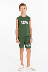 Женский костюм выполнен из хлопкового футера. Толстовка с короткими рукавами, прорезными карманами и застёжкой на молнию. Ширина капюшона регулируется при помощи шнура. Брюки с карманами по бокам, пояс и низ брюк на резине.