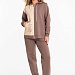 Женский костюм выполнен из однотонного футера с лайкрой двух цветов и состоит из толстовки и брюк. Толстовка с центральной застежкой на молнию, капюшоном и карманами кенгуру. Спереди и на спинке нанесён принт. Брюки с боковыми карманами и притачным поясом на резинке.
