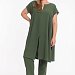 Костюм из струящегося полотна. Туника свободного силуэта, с разрезами спереди и по бокам, линия плеча спущена. Брюки заужены, по бокам карманы, пояс на резинке.