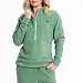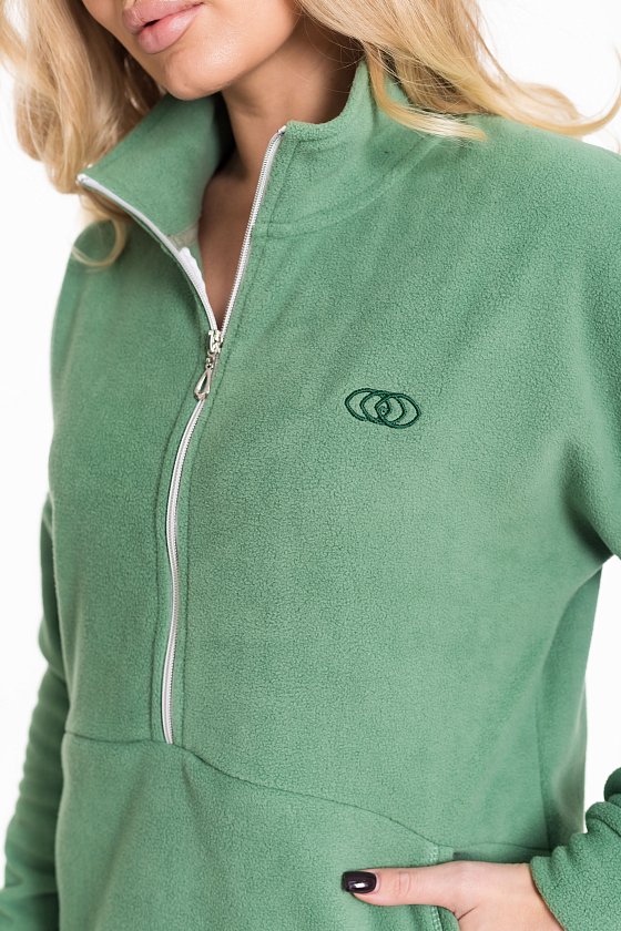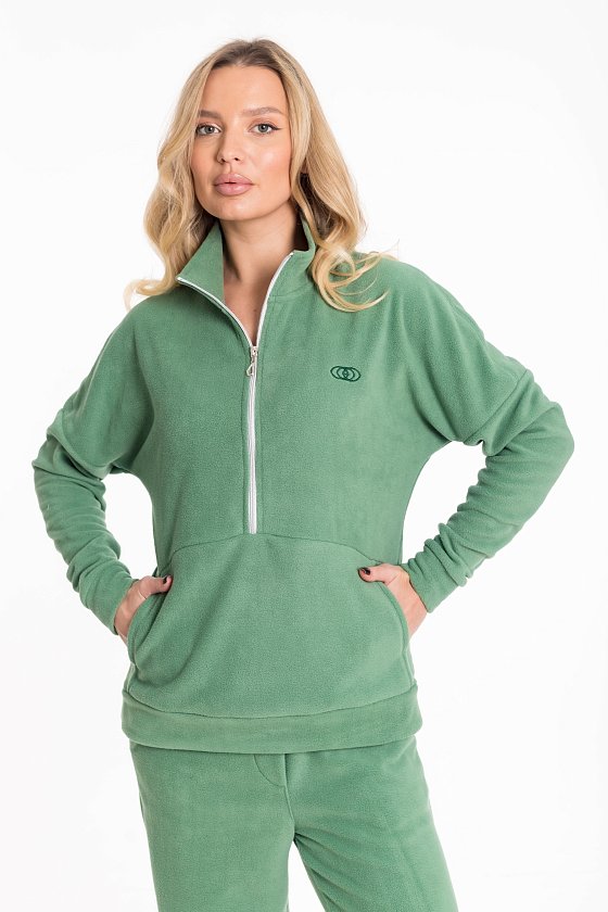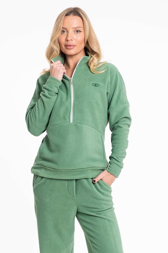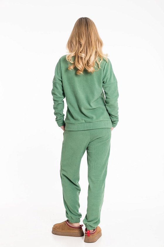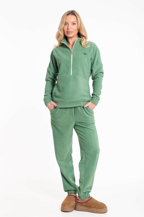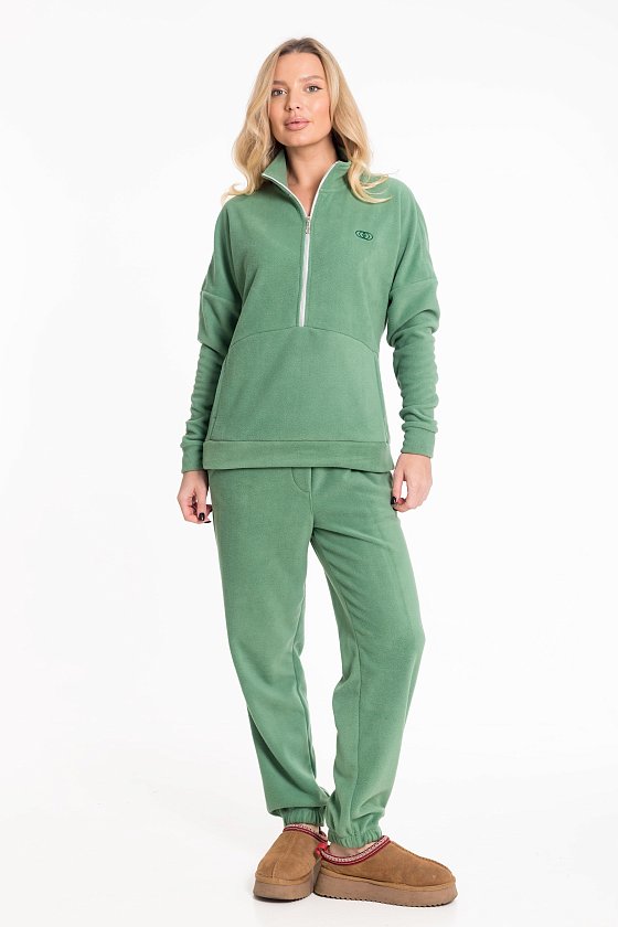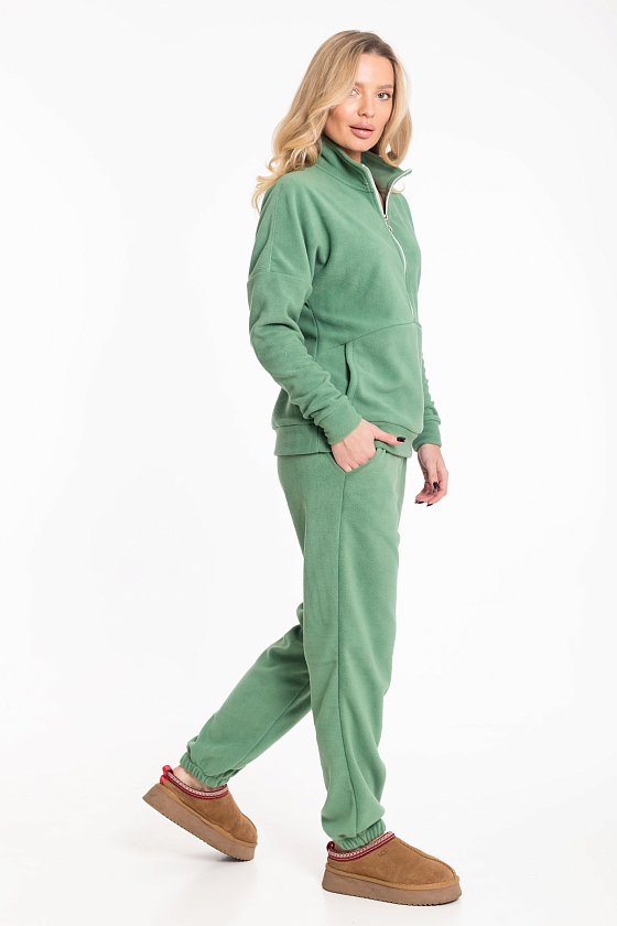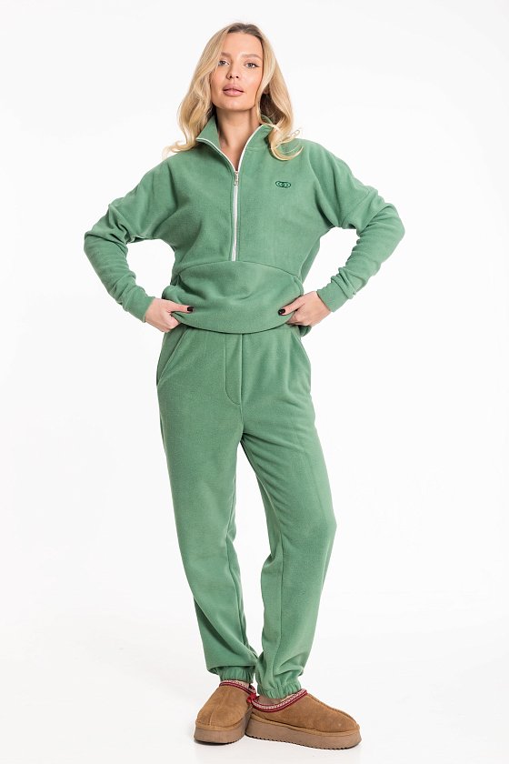 Женский костюм из флиса, включающий брюки и толстовку, станет отличным вариантом для повседневного образа. Толстовка выполнена с воротником-стойкой на молнии и спущенными рукавами с манжетами, что обеспечивает комфорт и удобство. Спереди — вышивка и карман-кенгуру, добавляющие модели выразительности. Брюки имеют свободный крой, оснащены широким поясом и манжетами на резинке по низу. Боковые карманы делают изделие ещё более практичным.
