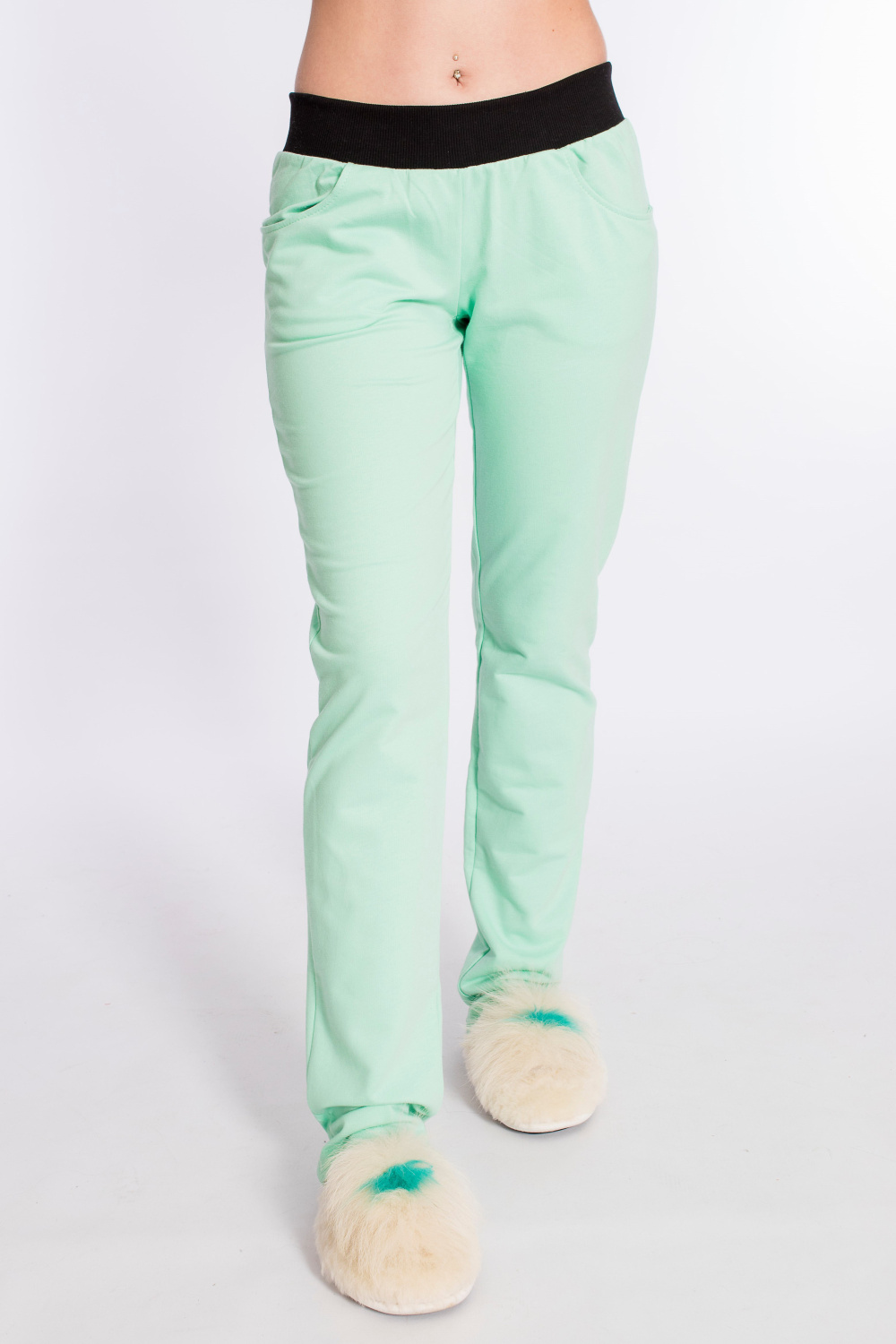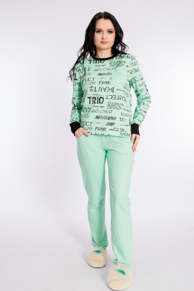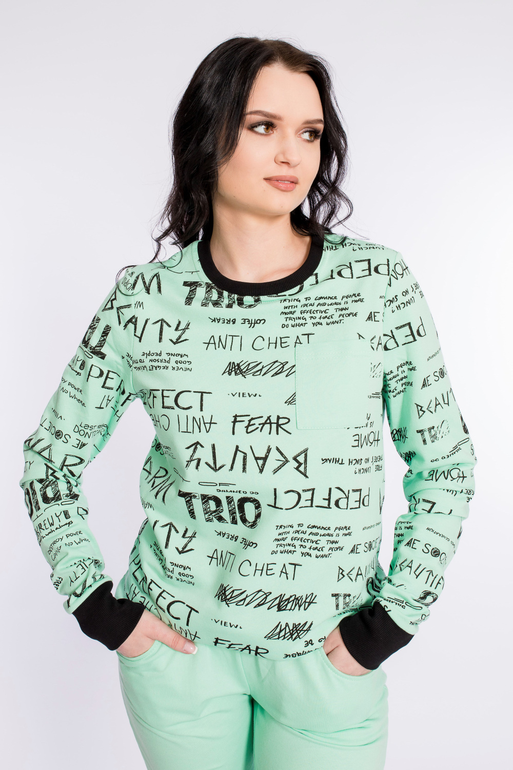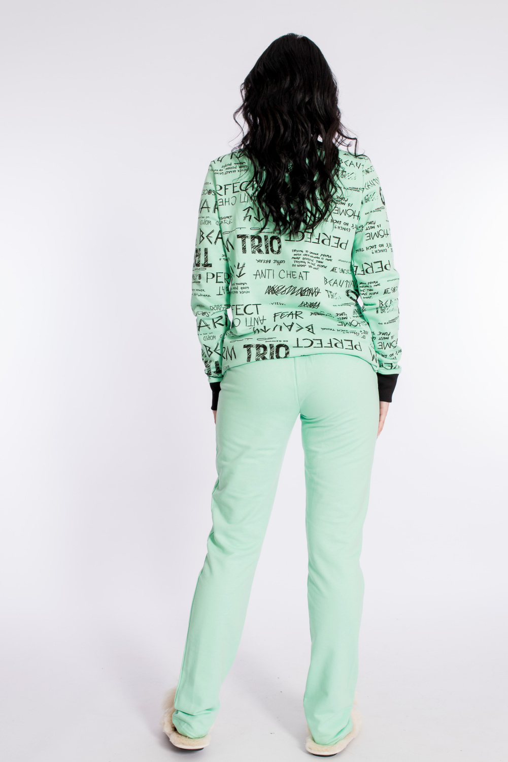 Костюм выполнен из футера двухнитки, состоит из толстовки и брюк с карманами. Толстовка с набивным рисунком, круглым вырезом горловины, длинным рукавом на манжете и кулиской по низу изделия. Спереди расположен нагрудный карман. Брюки однотонные, с поясом на резине и карманами по бокам.