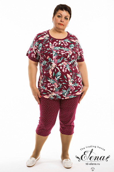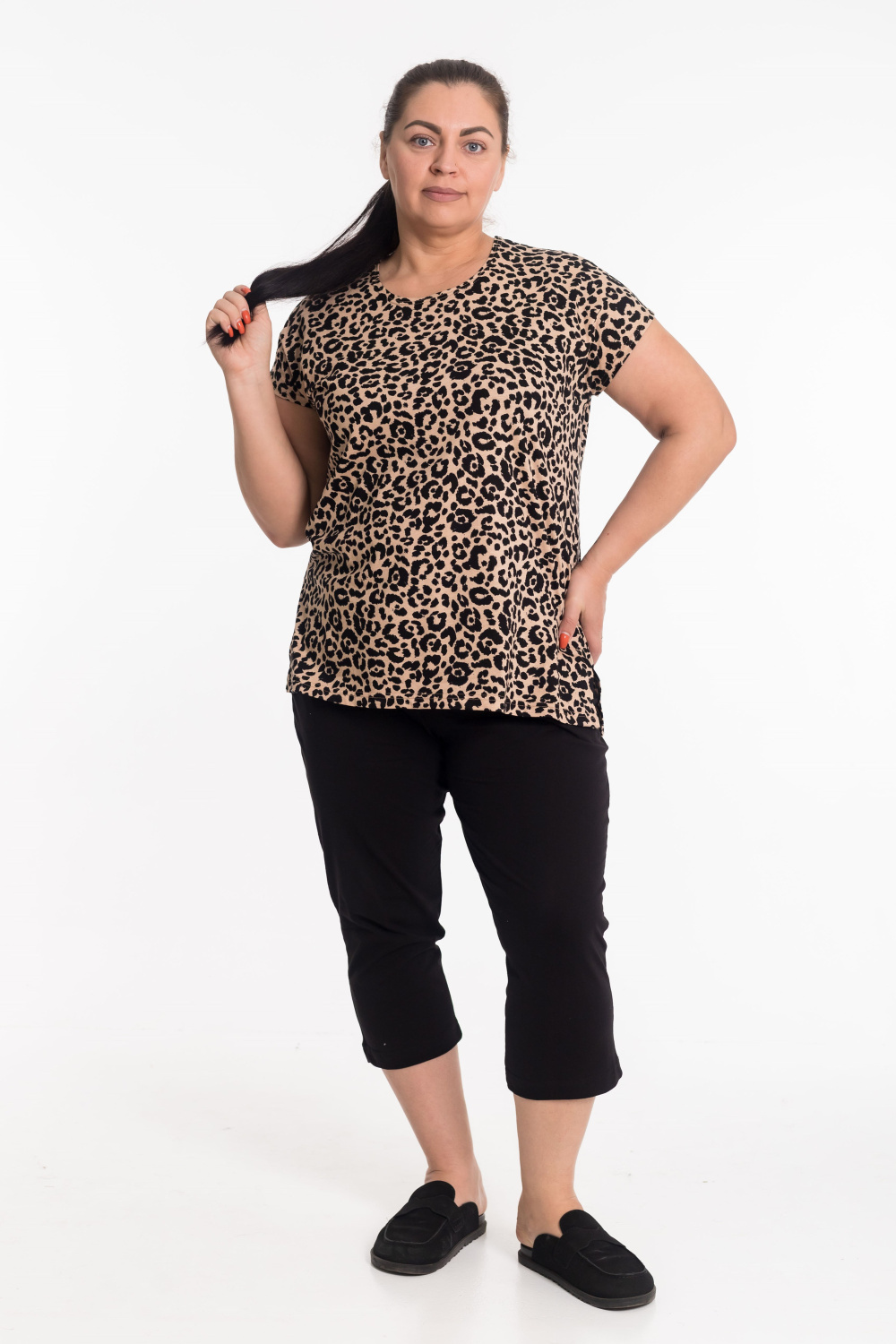 Женский костюм из кулирки — отличный выбор для повседневной носки. Футболка с набивкой "леопард", спущенными рукавами и круглым вырезом горловины украшена разрезами по бокам, что обеспечивает свободу движений. Однотонные капри гармонично дополняют образ. Этот яркий, современный дизайн одежды привлекает внимание своей смелой цветовой гаммой и создает энергичный и стильный образ. Изготовленный из натуральной ткани, костюм обеспечит комфорт в течение всего дня.