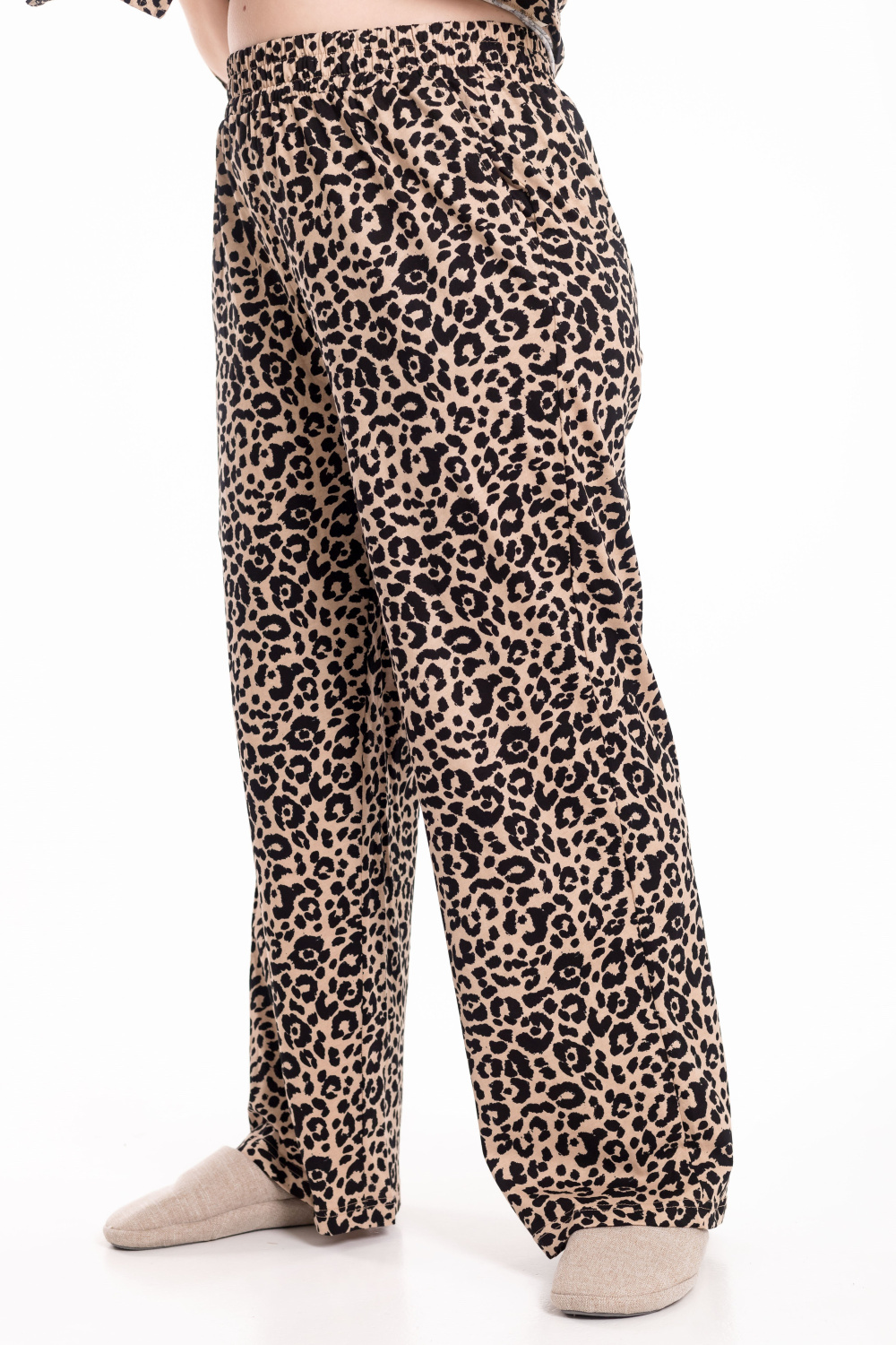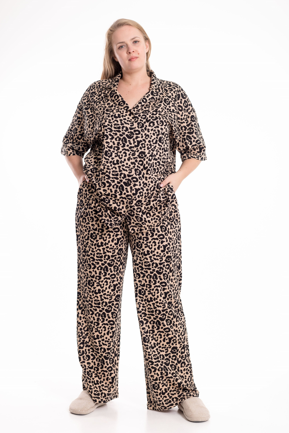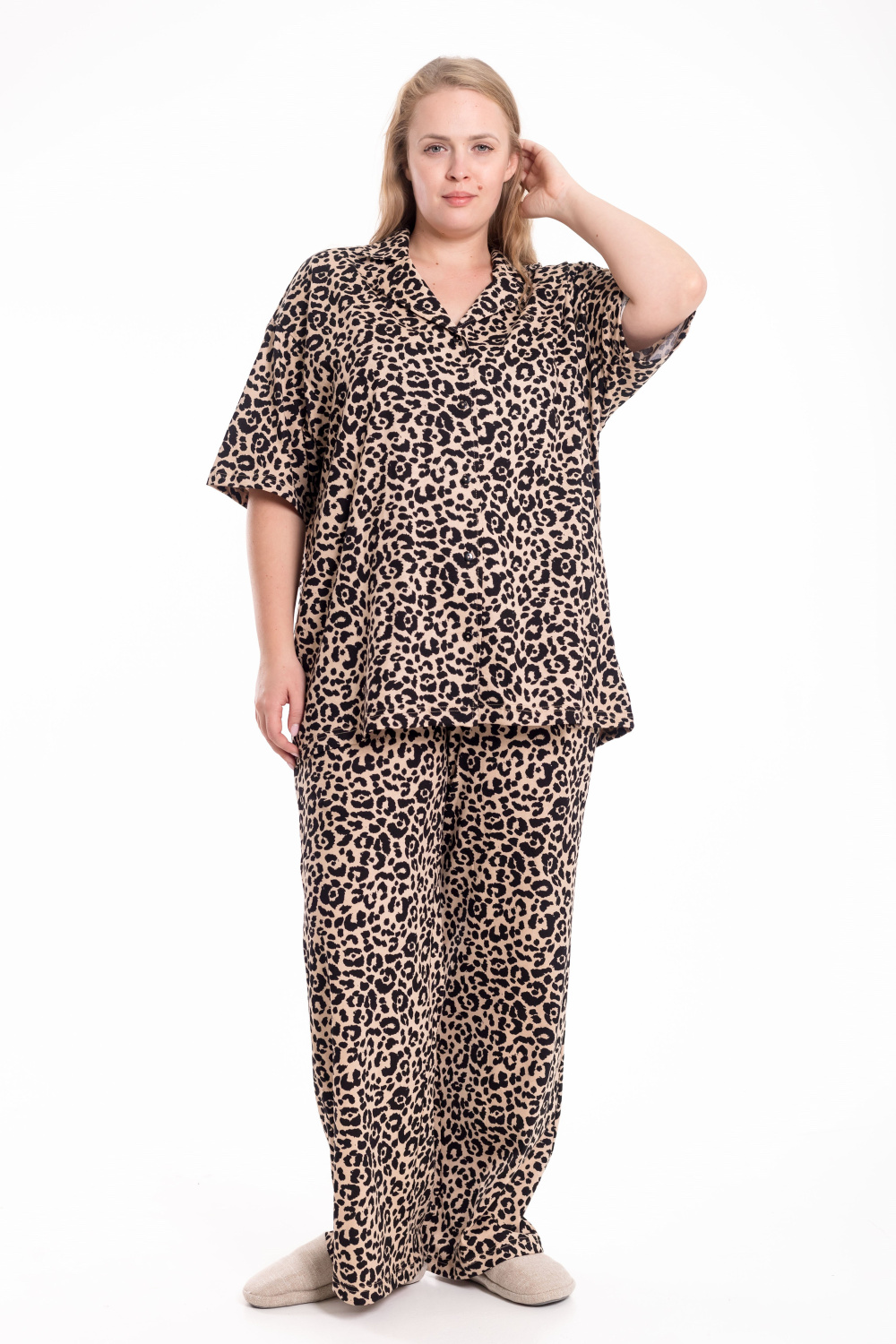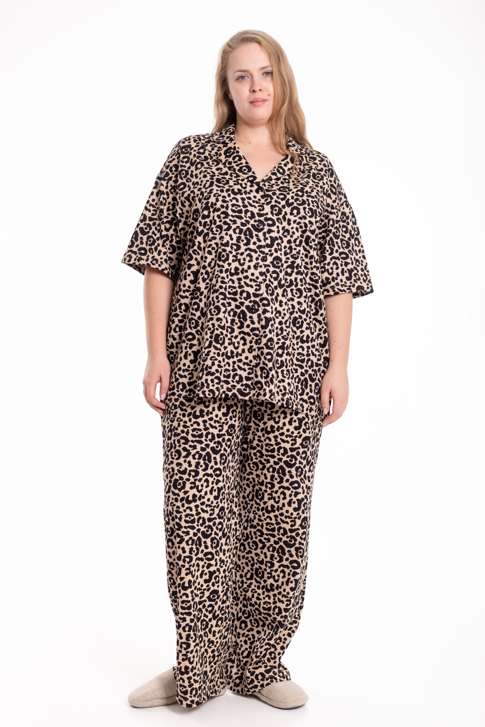 Костюм выполнен из хлопкового полотна и состоит из рубашки и брюк. Рубашка со спущенной линией плеча, рукавом длиной до локтя и застёжкой на пуговицах. Отложной воротник придаёт модели аккуратный и завершённый вид. Брюки прямого кроя с удобным поясом на резинке и боковыми карманами. Лаконичный костюм из натуральной ткани подойдёт для отдыха и повседневной носки.