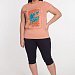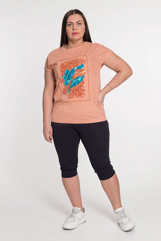 Футболка - спущенный рукав, круглый вырез горлочины, на полочке принт.