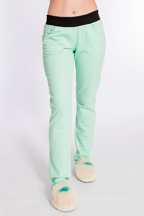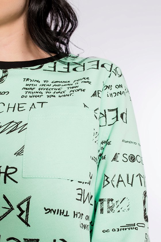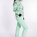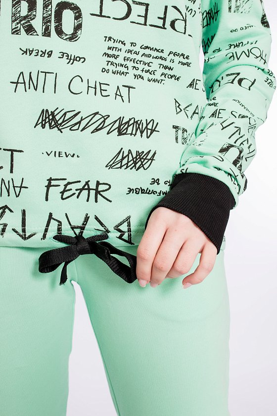 Костюм выполнен из футера двухнитки, состоит из толстовки и брюк с карманами. Толстовка с набивным рисунком, круглым вырезом горловины, длинным рукавом на манжете и кулиской по низу изделия. Спереди расположен нагрудный карман. Брюки однотонные, с поясом на резине и карманами по бокам.