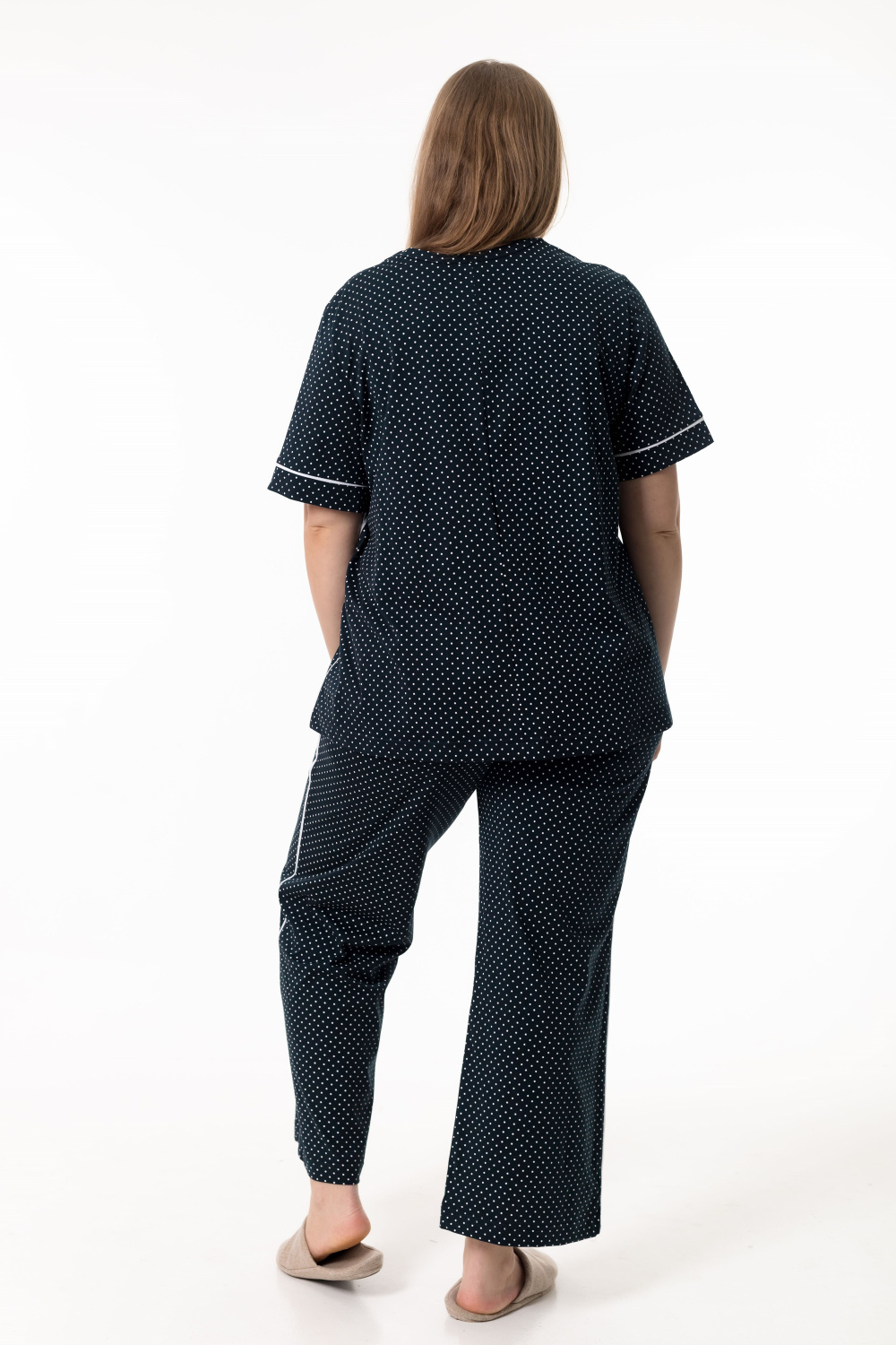 Костюм выполнен из мягкого хлопкового полотна, отлично подойдёт для комфортного отдыха и повседневной носки дома. В комплект входят футболка и широкие брюки, создающие лёгкий и свободный силуэт. Футболка имеет короткий рукав и расклёшенный крой, благодаря чему красиво сидит по фигуре и не сковывает движений. Круглый вырез горловины аккуратно обработан бейкой в тон основного полотна. Манжеты рукавов и боковые швы украшены контрастным кантом, который добавляет модели выразительный акцент. Брюки выполнены в широком крое, оснащены боковыми карманами и оформлены контрастным кантом по боковым швам, перекликающимся с отделкой футболки. Пояс на резинке обеспечивает удобную и комфортную посадку. Костюм станет отличным выбором для тех, кто ценит натуральные ткани, свободу движений и стильные детали в домашней одежде.