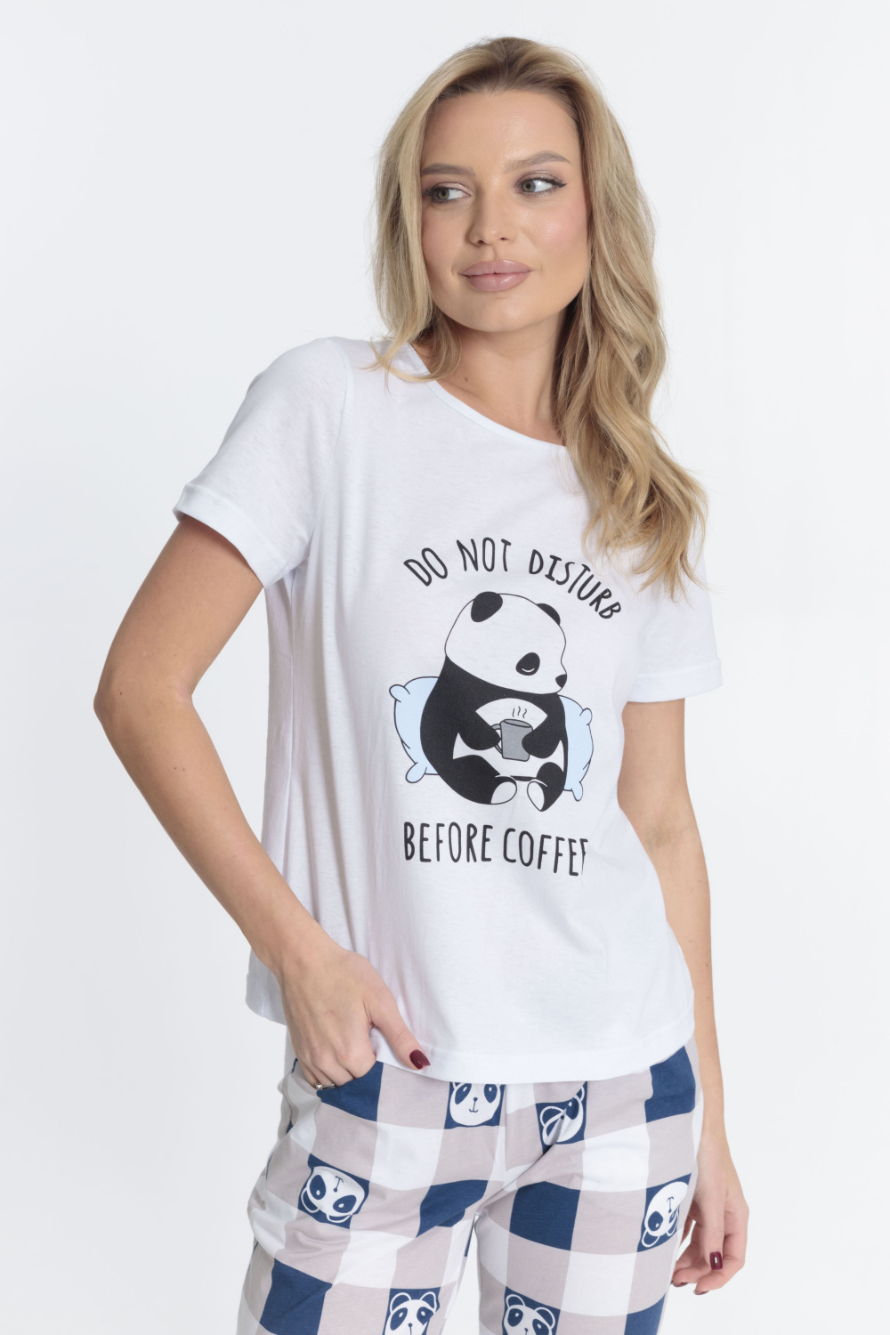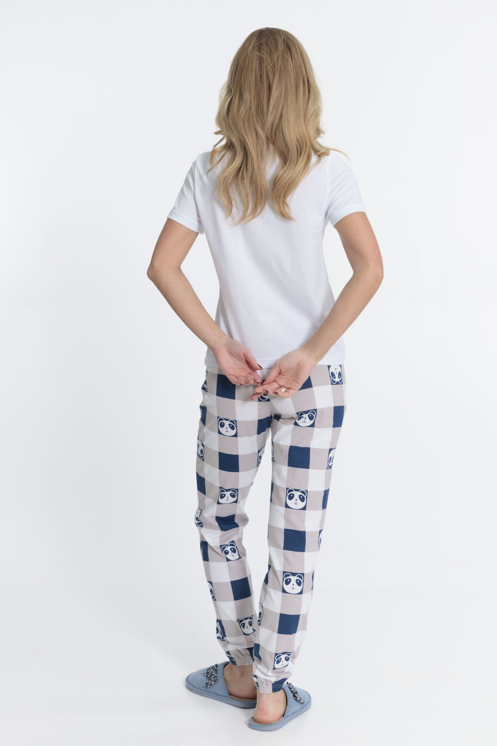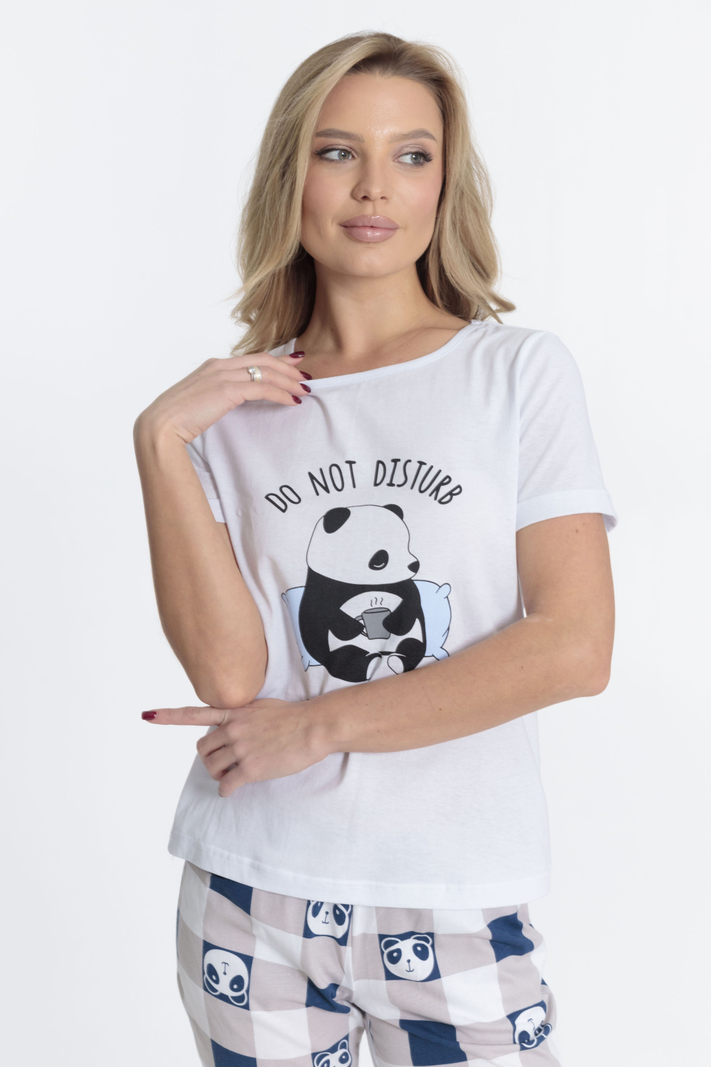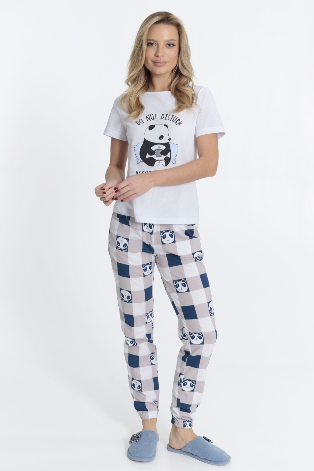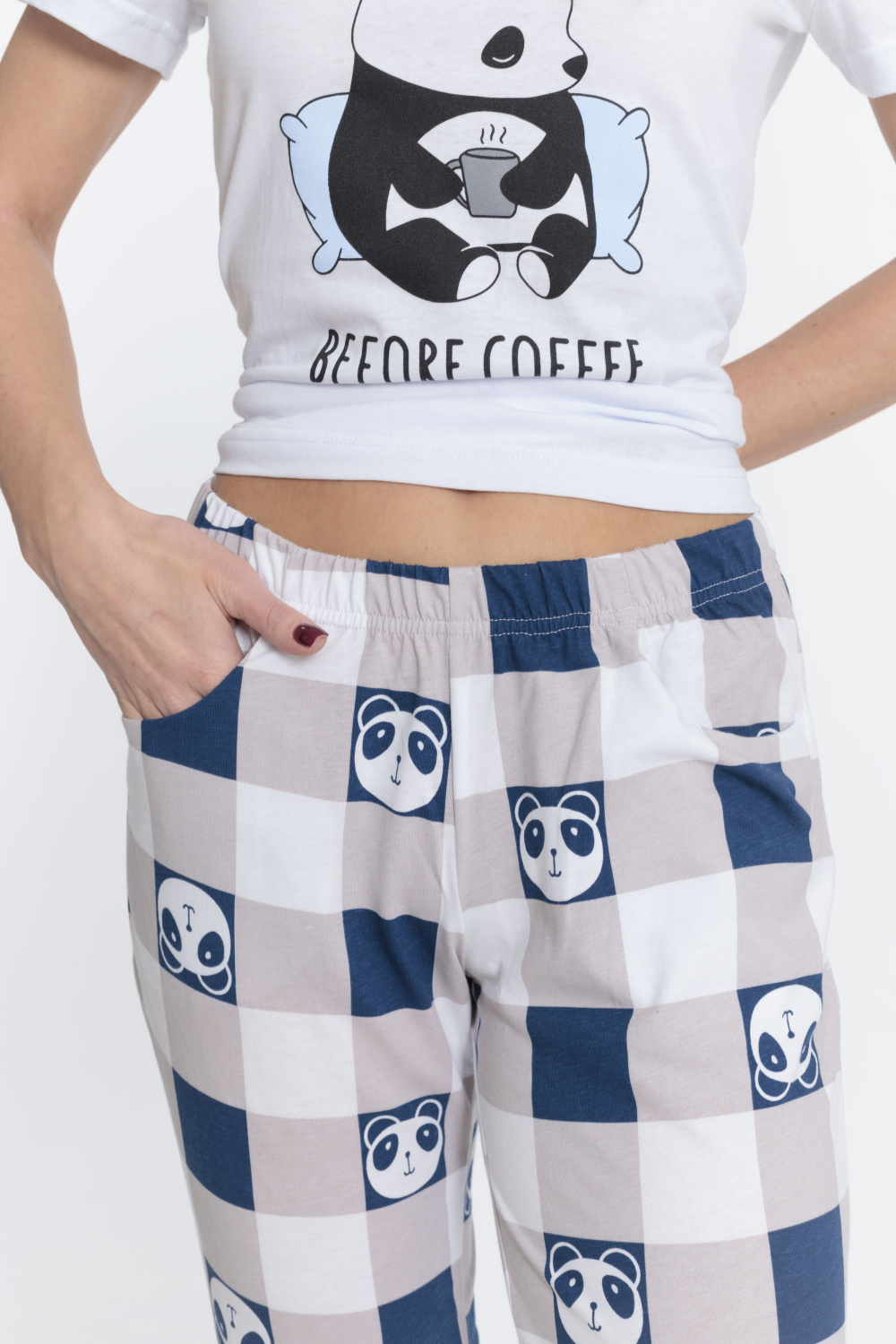 Костюм выполнен из кулирки, 100% хлопок. Футболка однотонная, c коротким рукавом и круглым вырезом горловины, с принтом спереди. Брюки на резинке сверху и снизу, с боковыми карманами.