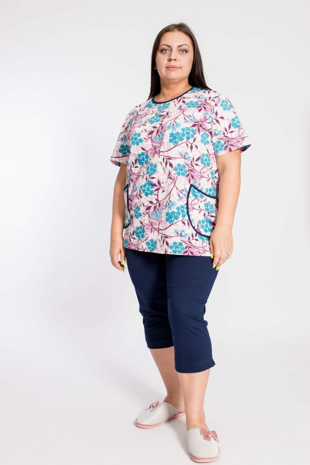 Женский костюм выполнен из кулирки, 100% хлопок. Состоит из однотонных капри и футболки с набивным рисунком. Футболка с круглым вырезом горловины и накладными карманами спереди. Капри с поясом на резине и карманами по бокам.