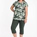 Костюм выполнен из х/б полотна. Футболка с коротким спущенным рукавом, крой прямой, свободный, по бокам разрезы. Горловина имеет круглый вырез. Капри с карманами, по бокам внизу небольшие разрезы.
