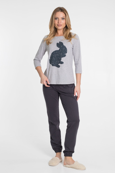 Костюм выполнен из кулирки. Футболка однотонная, с круглым вырезом горловины, спереди расположен принт. Втачной рукав длиной 3/4. Брюки на резинке сверху и снизу, с боковыми карманами.