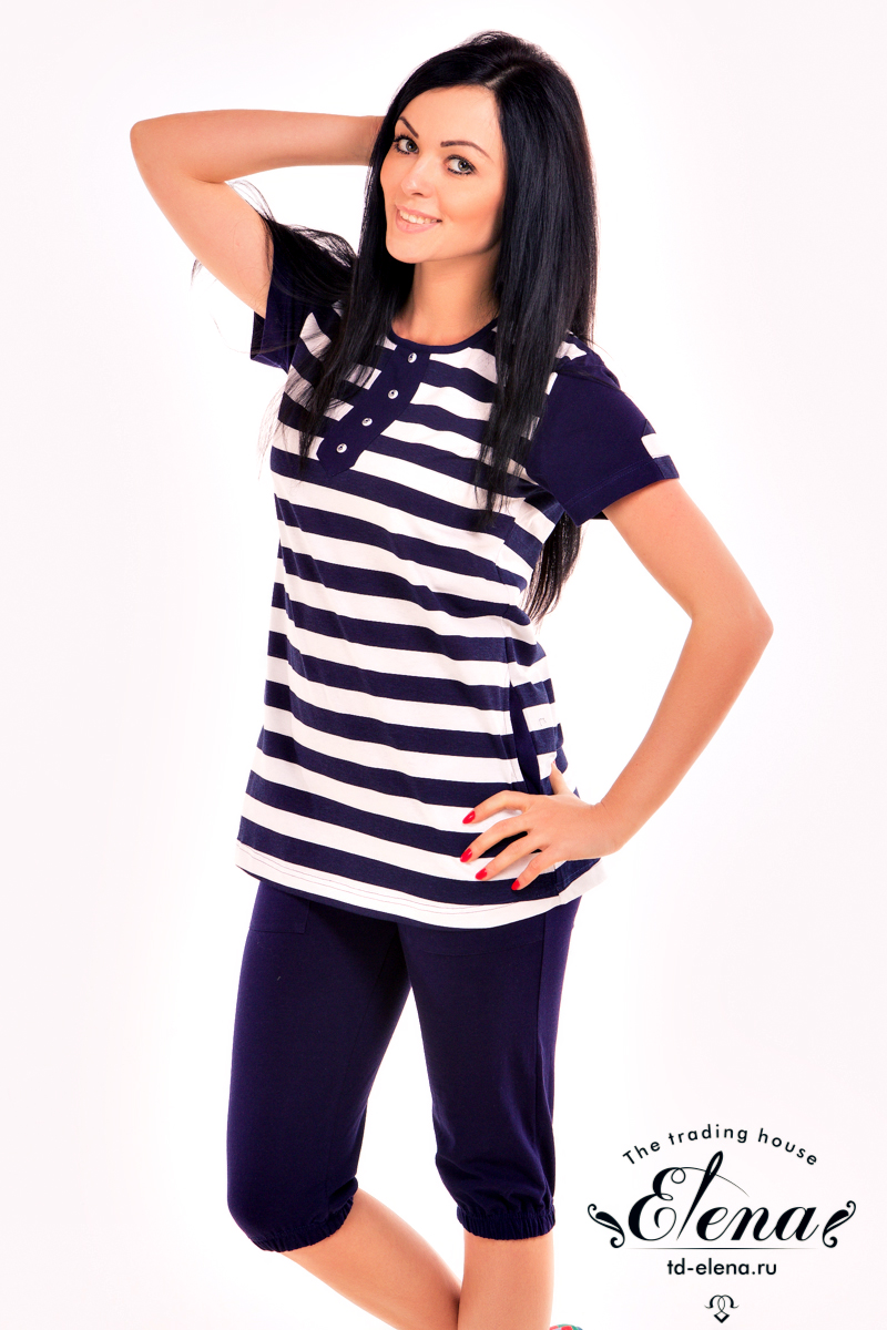 Костюм выполнен из хлопкового полотна. Футболка с коротким рукавом с отделкой, горловина с круглым вырезом, в качестве декора пришиты пуговицы. В боковых швах размещены карманы. Капри с карманами, низ и пояс на резинке.