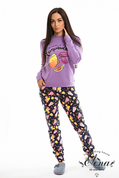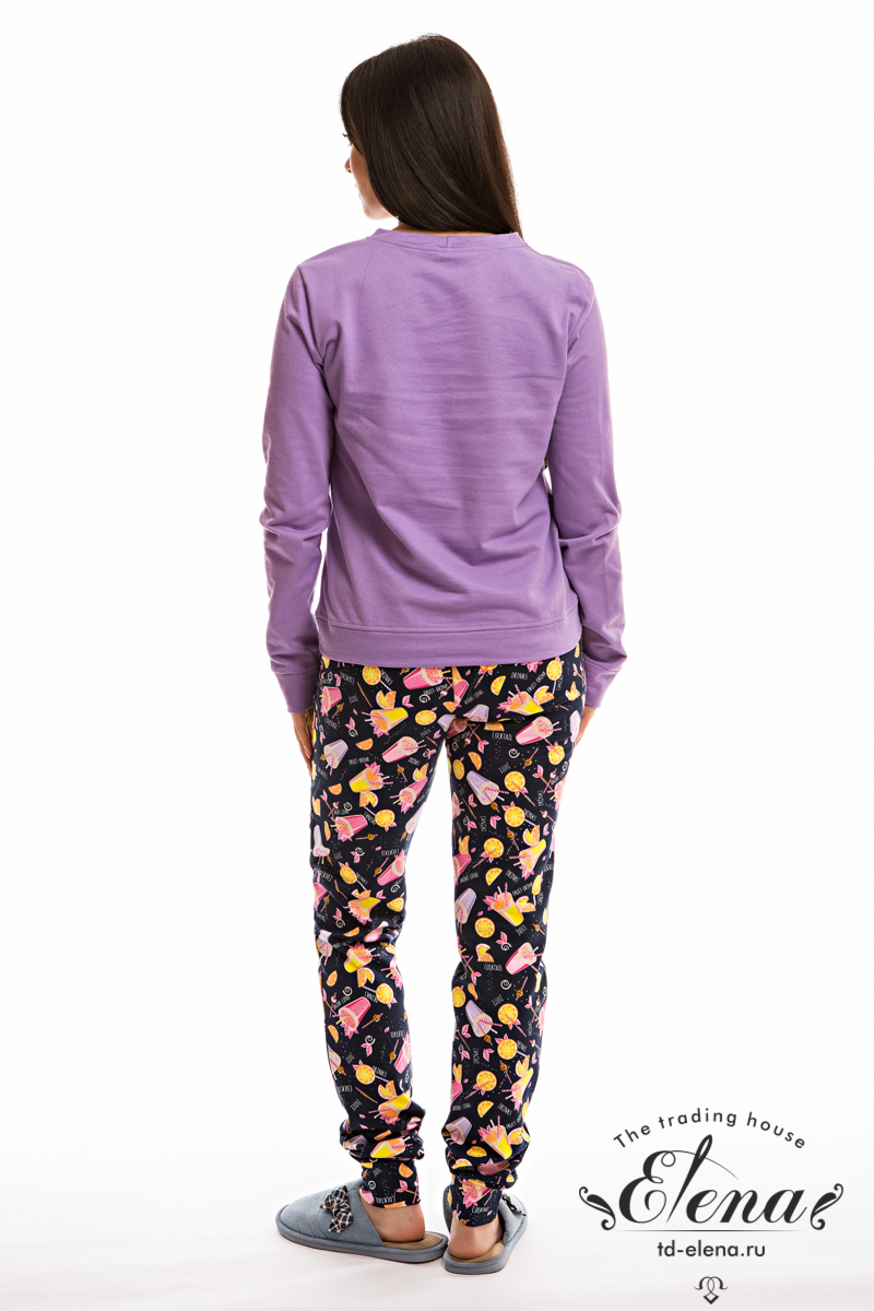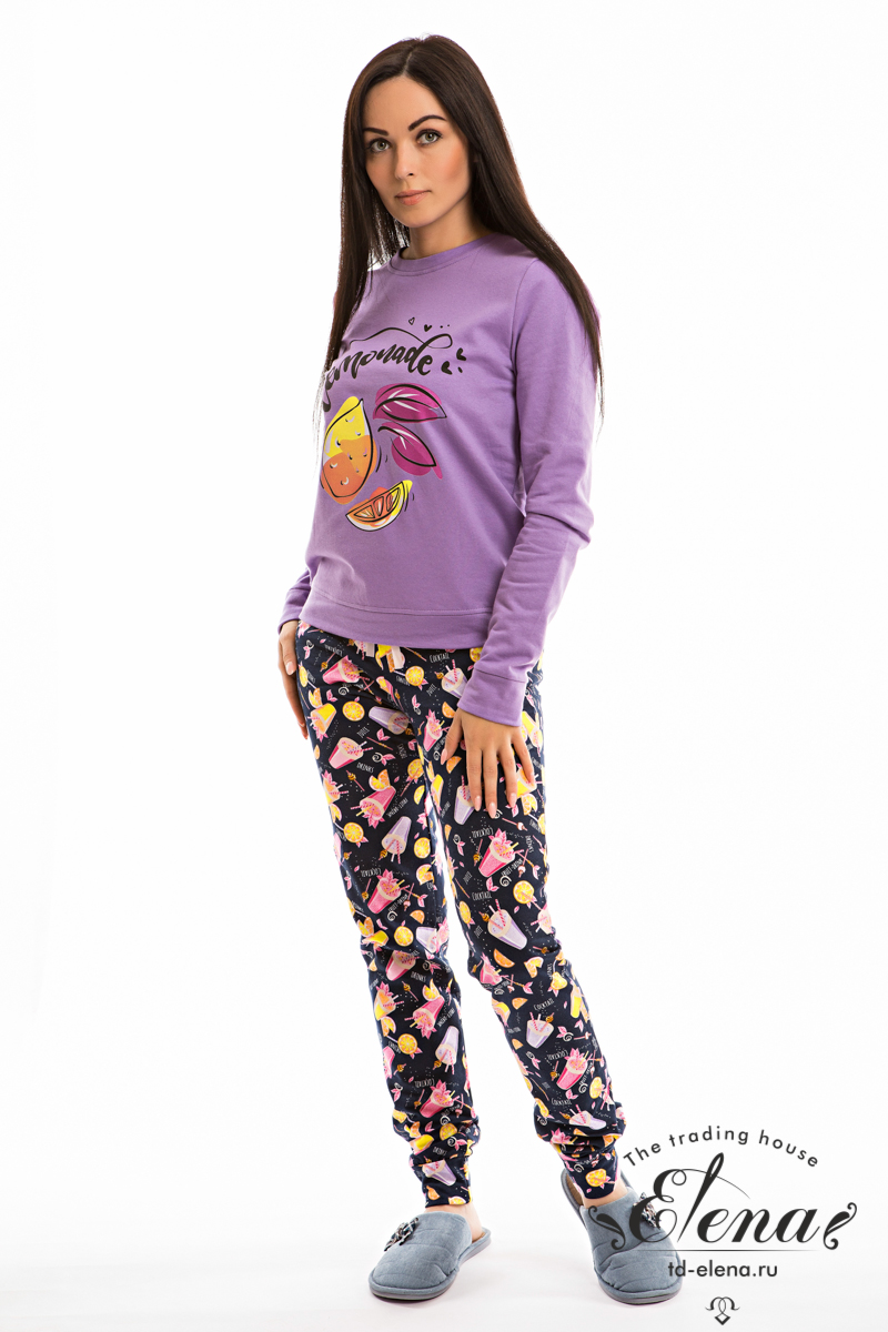 Костюм выполнен из футера с начёсом. Состоит из брюк и толстовки с длинным рукавом. Брюки с поясом на резинке и двумя боковыми карманами. Спереди на толстовке расположен красивый принт.