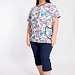 Женский костюм выполнен из кулирки, 100% хлопок. Состоит из однотонных капри и футболки с набивным рисунком. Футболка с круглым вырезом горловины и накладными карманами спереди. Капри с поясом на резине и карманами по бокам.