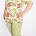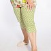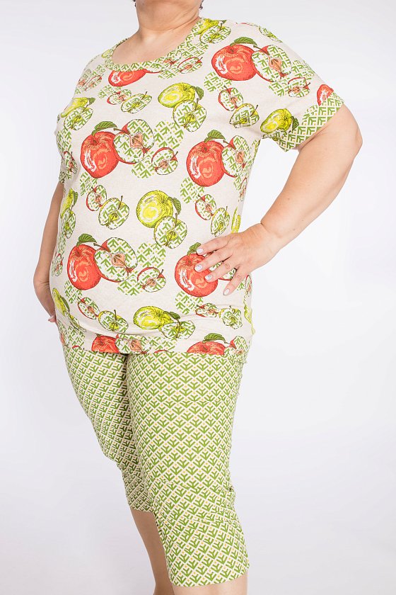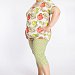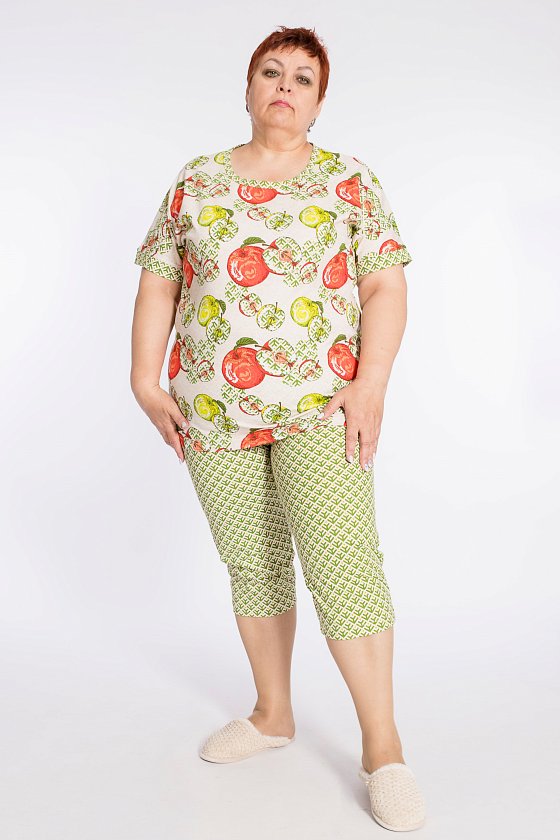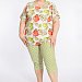 Женский костюм выполнен из хлопкового полотна, состоит из футболки и капри. Футболка однотонная, круглый вырез горловины и низ рукавов отделаны бейкой из контрастного по цвету полотна. Капри из полотна с набивкой, пояс на резинке.
