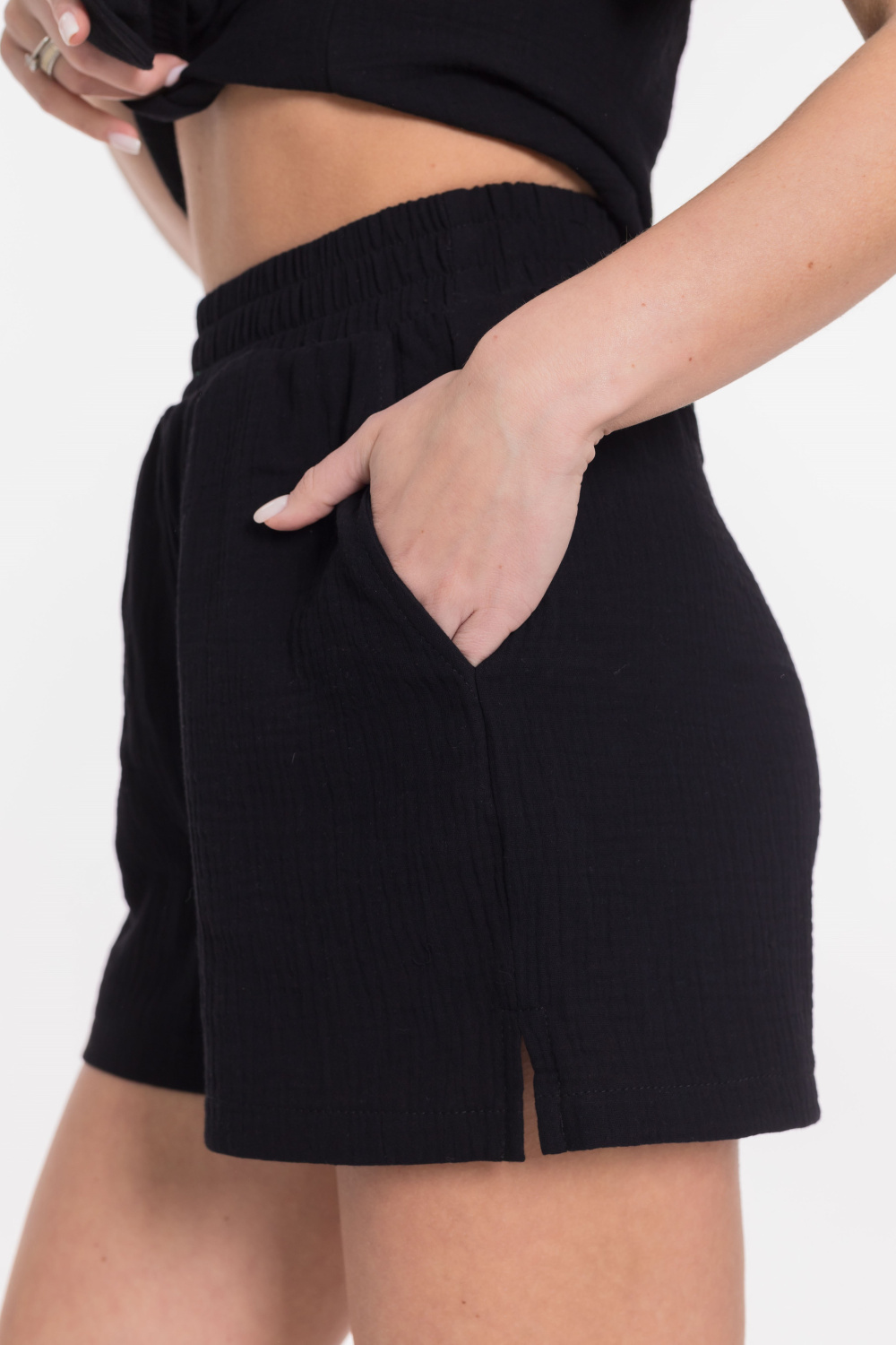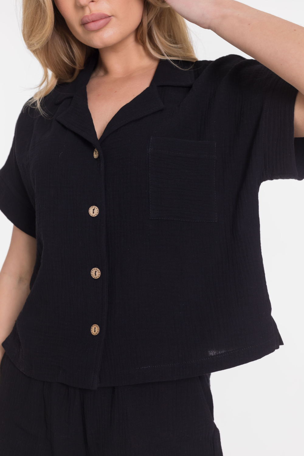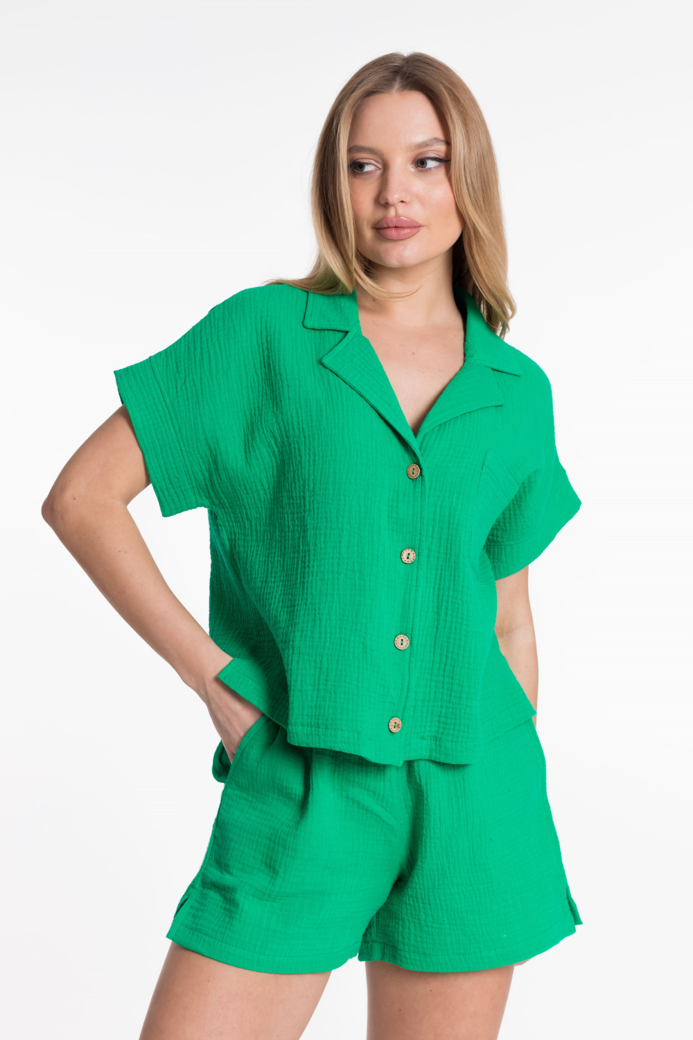 Женский костюм из муслина — отличный выбор для повседневной носки. Рубашка свободного силуэта с цельнокроеным рукавом и застёжкой на пуговицах обеспечивает свободу движений. Боковые разрезы и накладной карман на полочке придают изделию оригинальность. Шорты с боковыми карманами, разрезами внизу и поясом на резинке также обеспечивают комфорт при носке. Однотонный дизайн костюма позволяет сочетать его с различными элементами гардероба. Такой наряд подойдёт для прогулок, неформальных встреч или отдыха. Изготовленный из натуральной ткани, костюм обеспечит комфорт в течение всего дня.