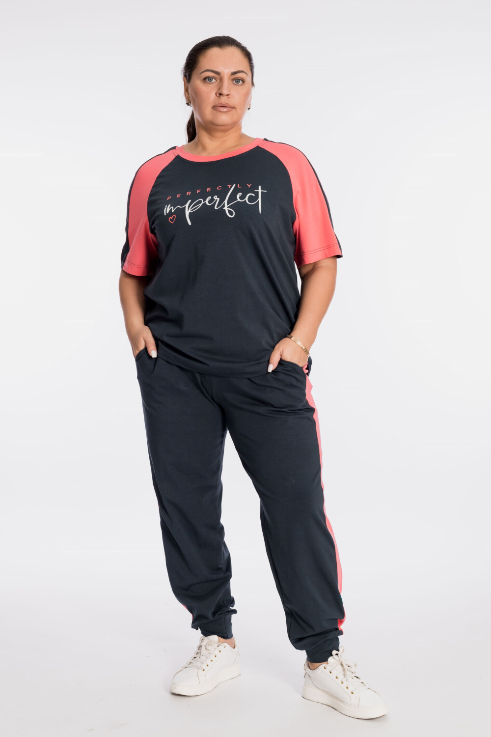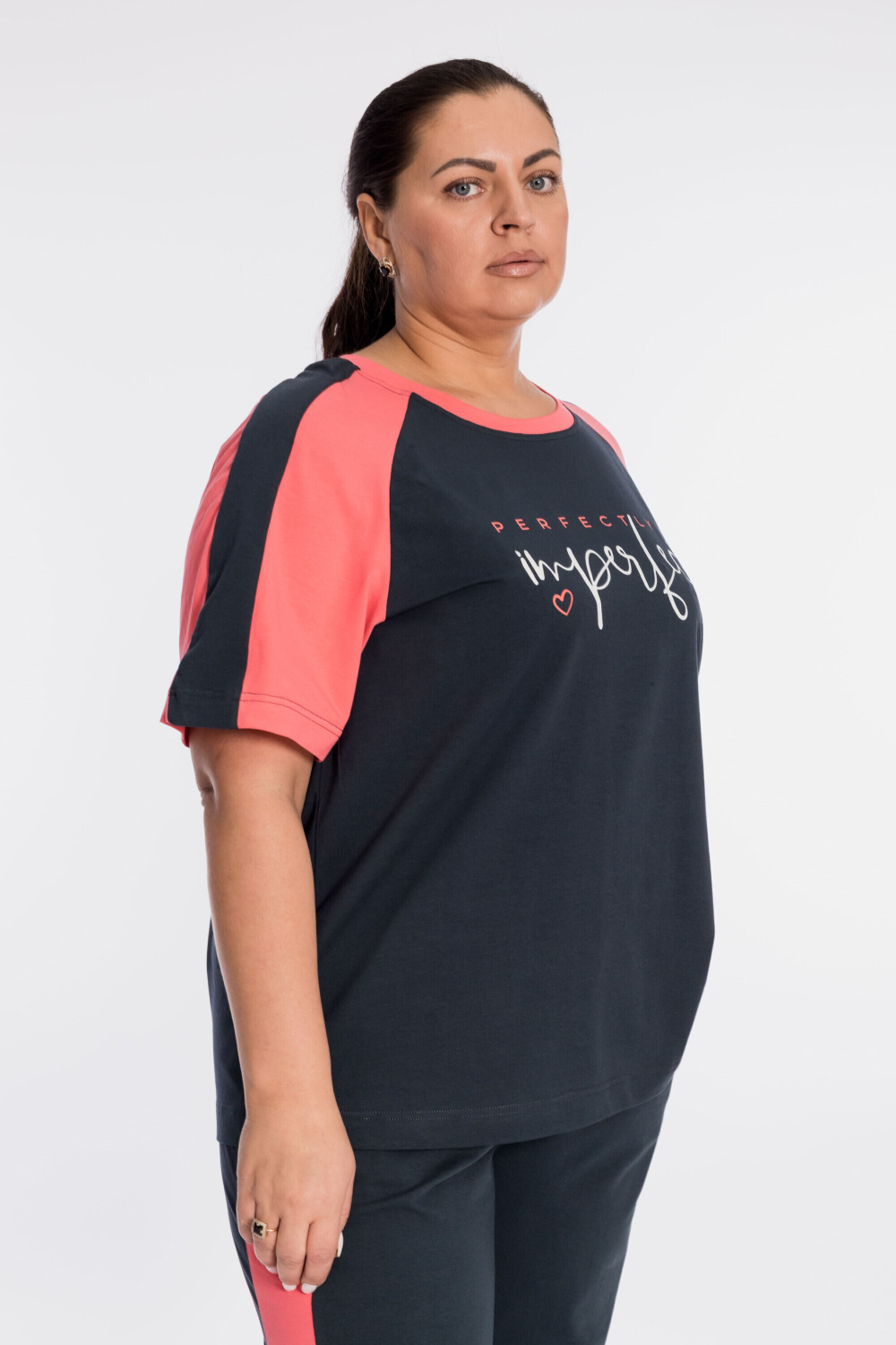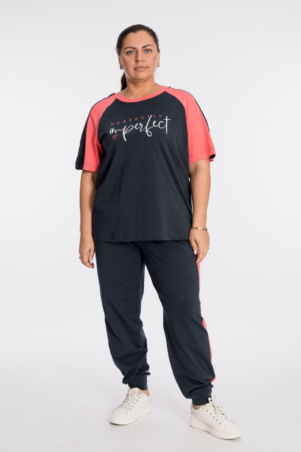 Костюм выполнен из кулирки с добавлением лайкры, состоит из футболки и брюк. Футболка свободного силуэта, с рукавом покроя реглан, круглый вырез горловины оформлен планкой. Спереди нанесён принт. Брюки с отделочными полосами и карманами по бокам, притачным поясом и манжетами внизу.