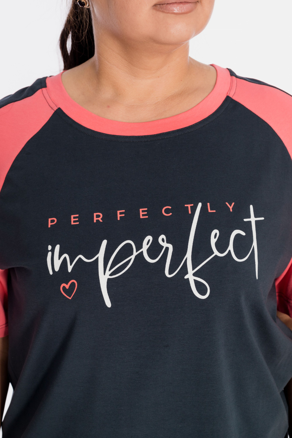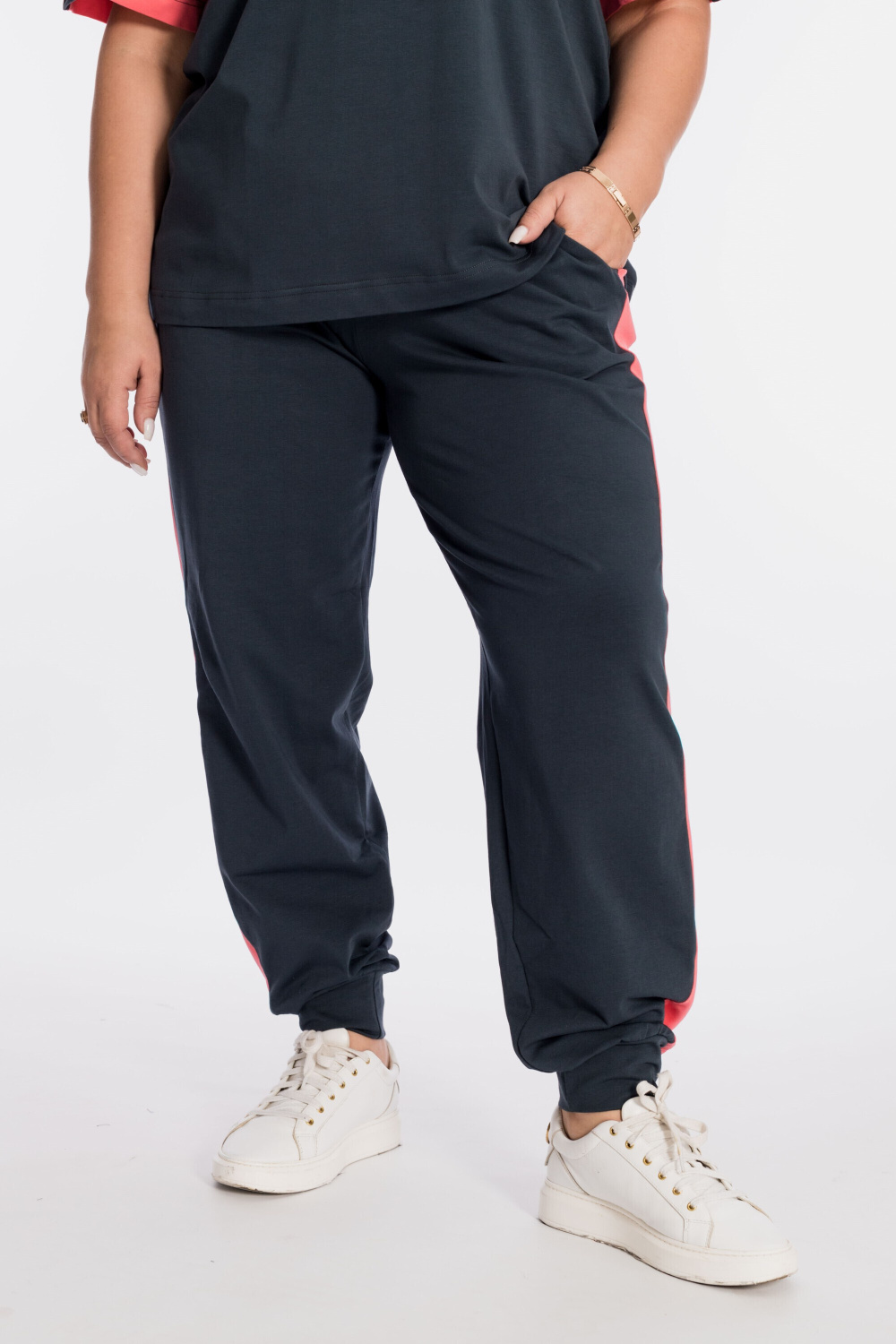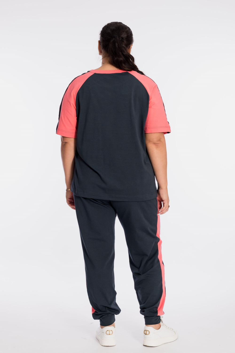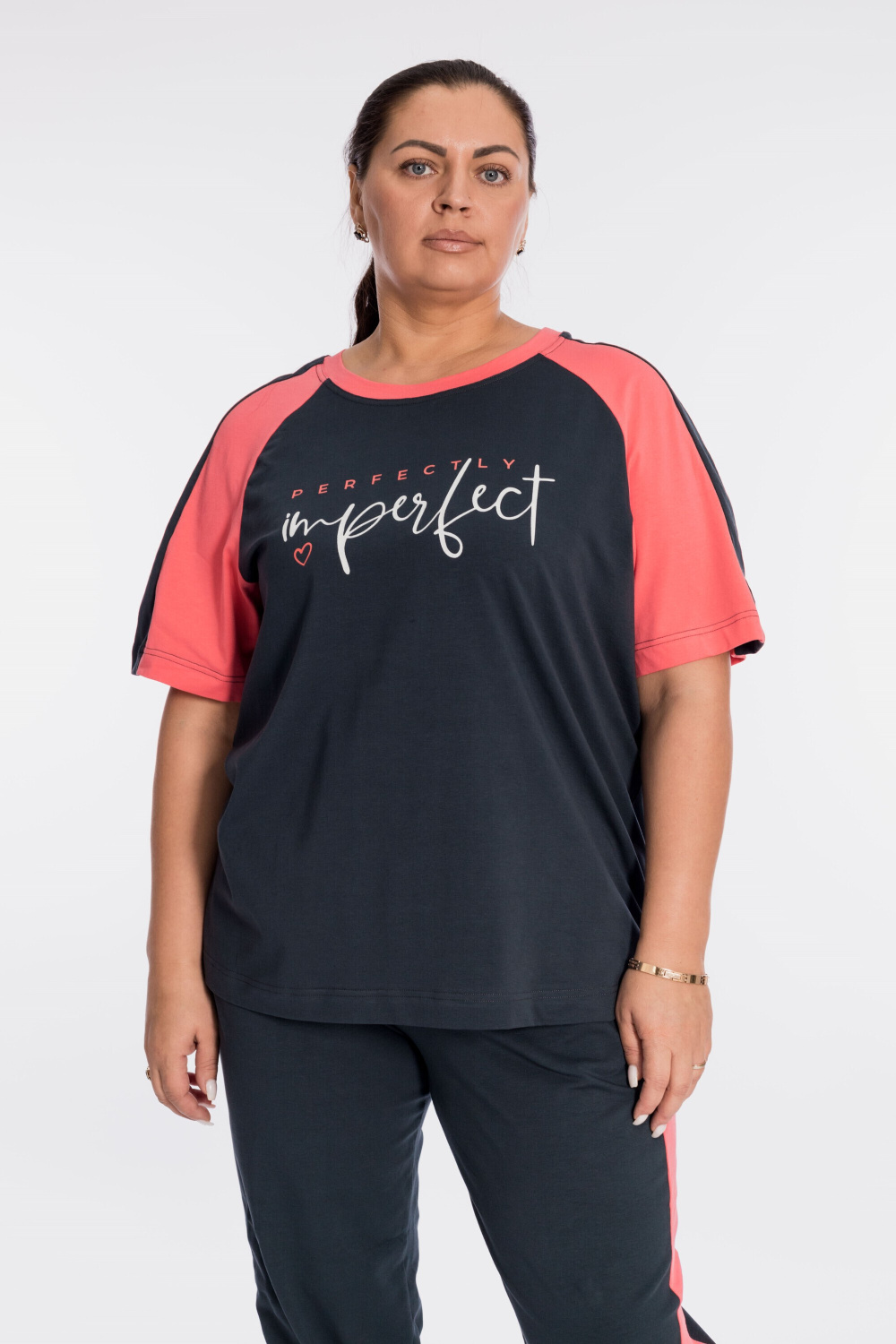 Костюм выполнен из кулирки с добавлением лайкры, состоит из футболки и брюк. Футболка свободного силуэта, с рукавом покроя реглан, круглый вырез горловины оформлен планкой. Спереди нанесён принт. Брюки с отделочными полосами и карманами по бокам, притачным поясом и манжетами внизу.